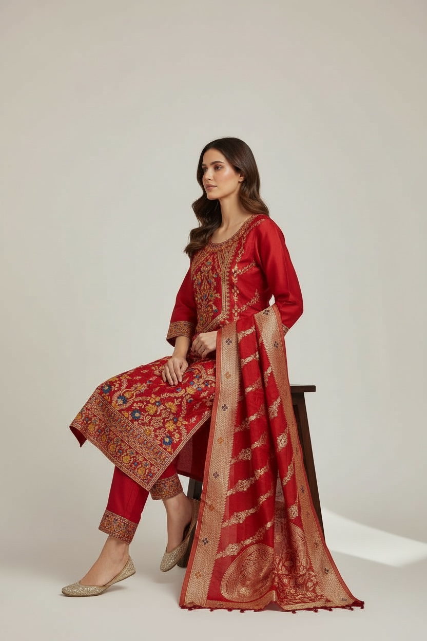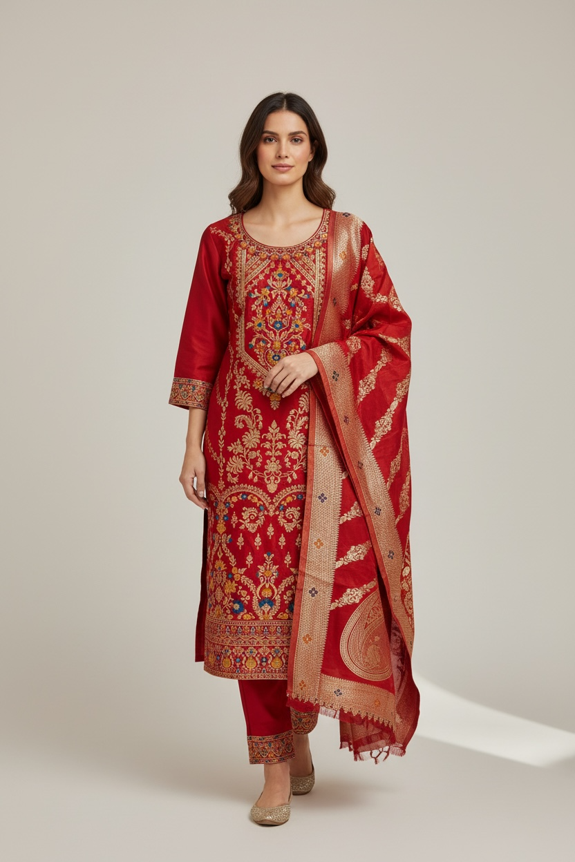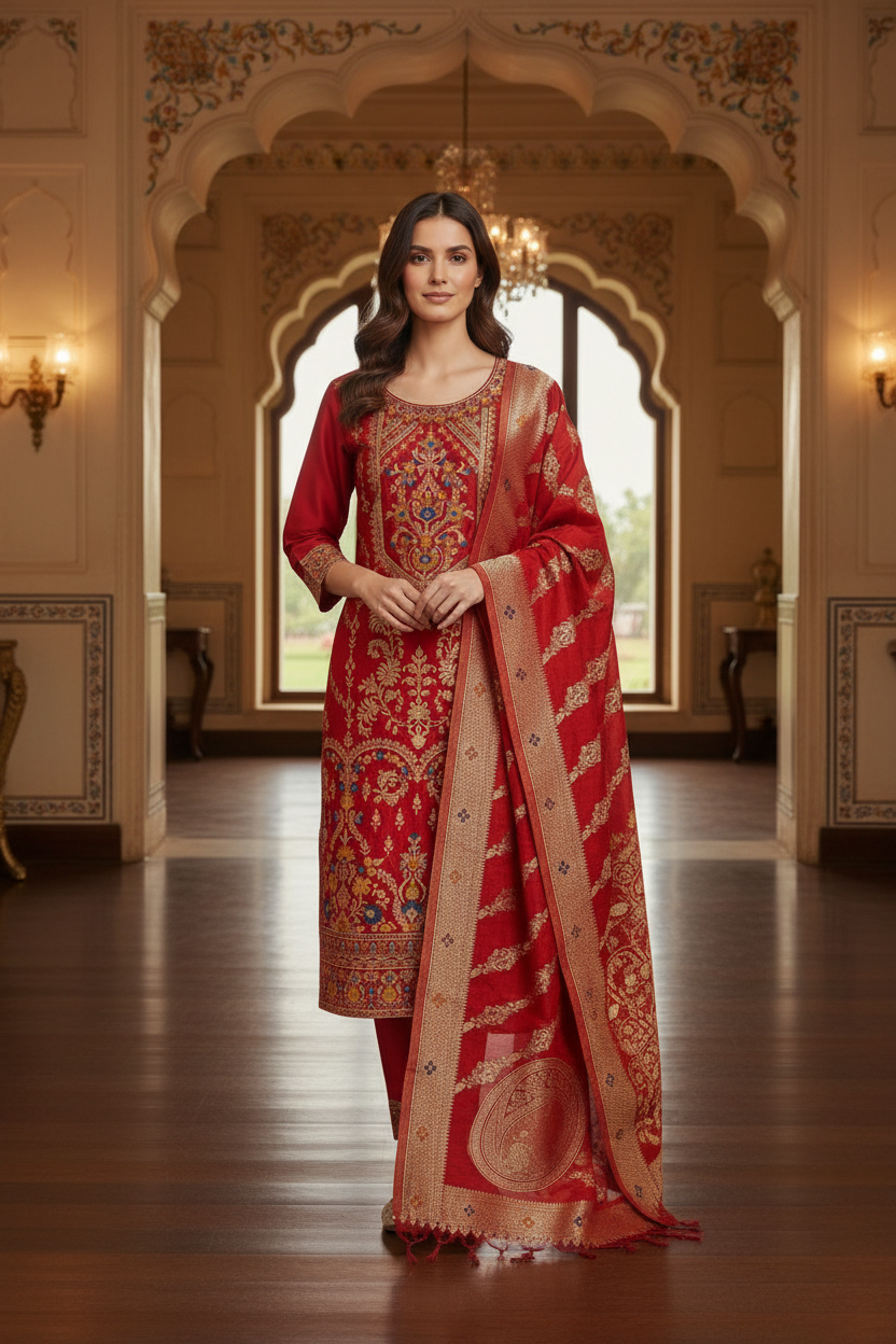 Crafted from luxurious silk, our Banarasi Salwar Suit elevates your ethnic wardrobe. The set boasts traditional Banarasi weaving techniques, adding intricate details to the garment. Experience the exclusive comfort and elegance of silk with our expertly tailored Salwar Suit. Perfect for any occasion, this set is a must-have for any fashion-forward individual.