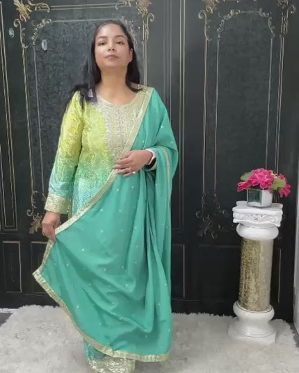 Elevate your style with our designer Bandhani silk sharara suit. Perfect for haldi mehandi functions, this suit will make you stand out at any party. Premium quality fabric and unique design make it the best choice for any occasion.