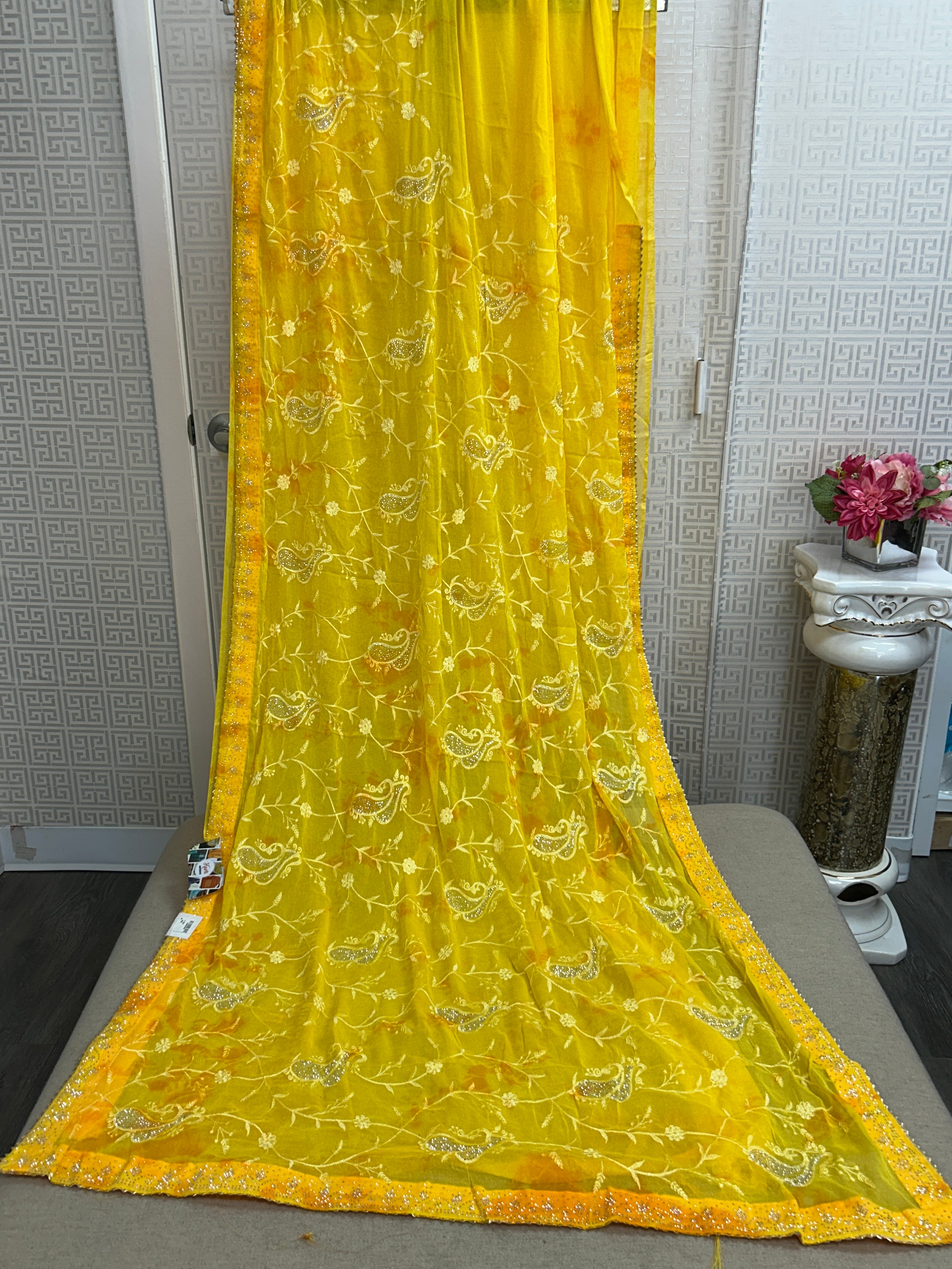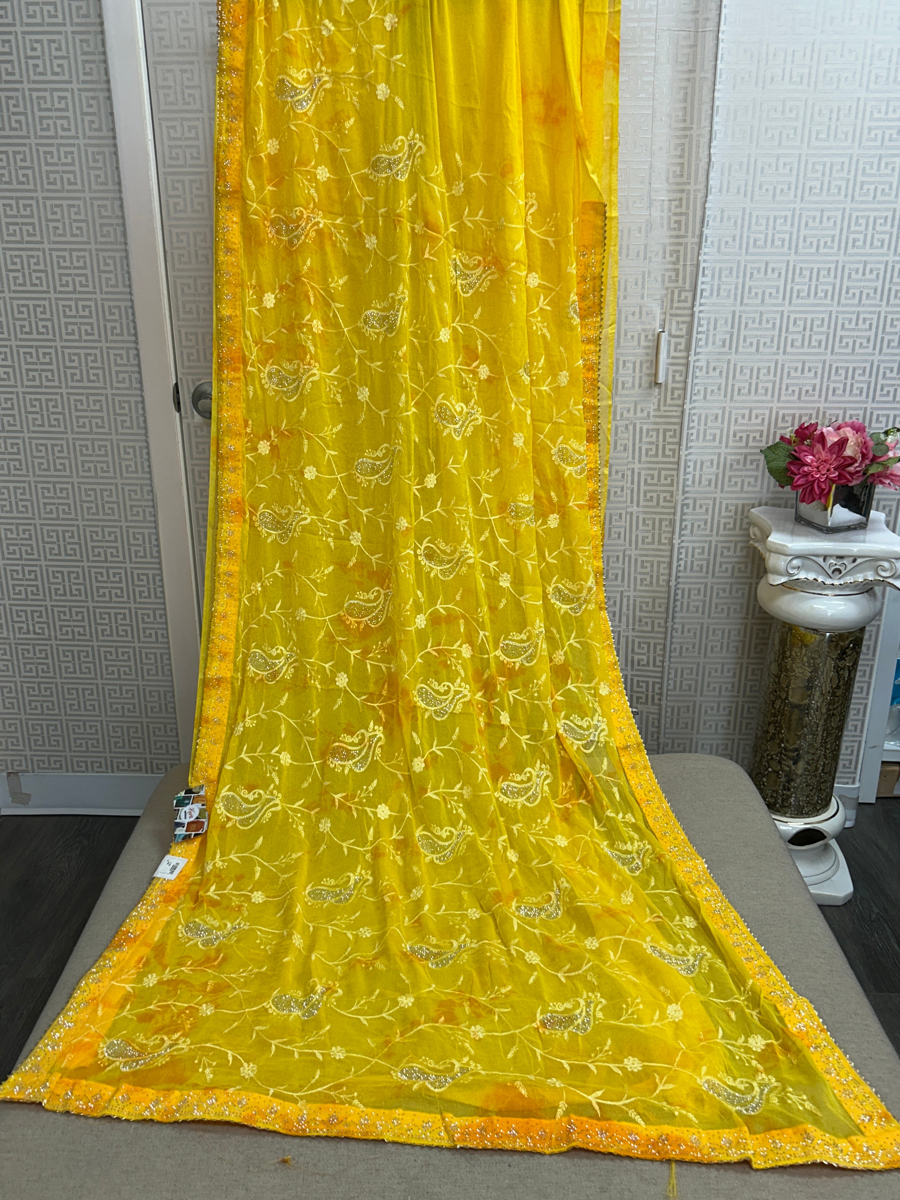 Elevate your style with this Chiffon saree featuring beautiful embroidery work. Made of lightweight and luxurious fabric, this sari will add a touch of elegance to any occasion. Perfect for weddings, parties, or formal events.