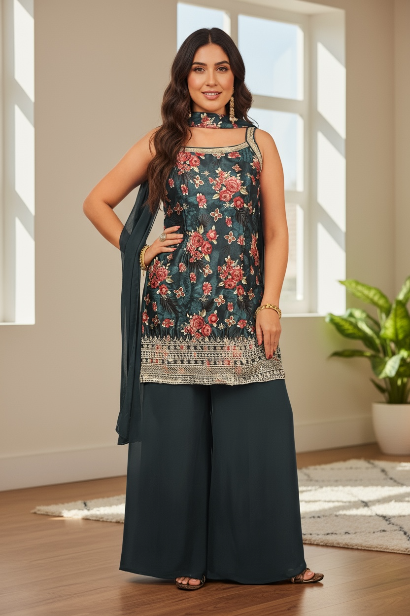 Experience the stunning elegance of our crape silk sharara suit in dark green. Crafted for comfort and style, this suit is perfect for any occasion. Its luxurious fabric drapes beautifully, providing a sleek and sophisticated look. Elevate your wardrobe with this timeless piece.