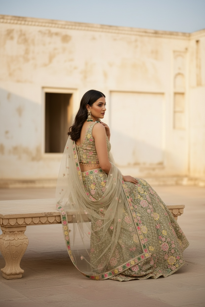 This Designer Lehenga Choli set features an intricately crafted lehenga, designed to enhance aesthetic appeal while providing comfort. The high-quality fabric ensures durability, while the elegant silhouette flatters various body types. Suitable for formal occasions, this set combines tradition with modern design, making it a versatile addition to any wardrobe.