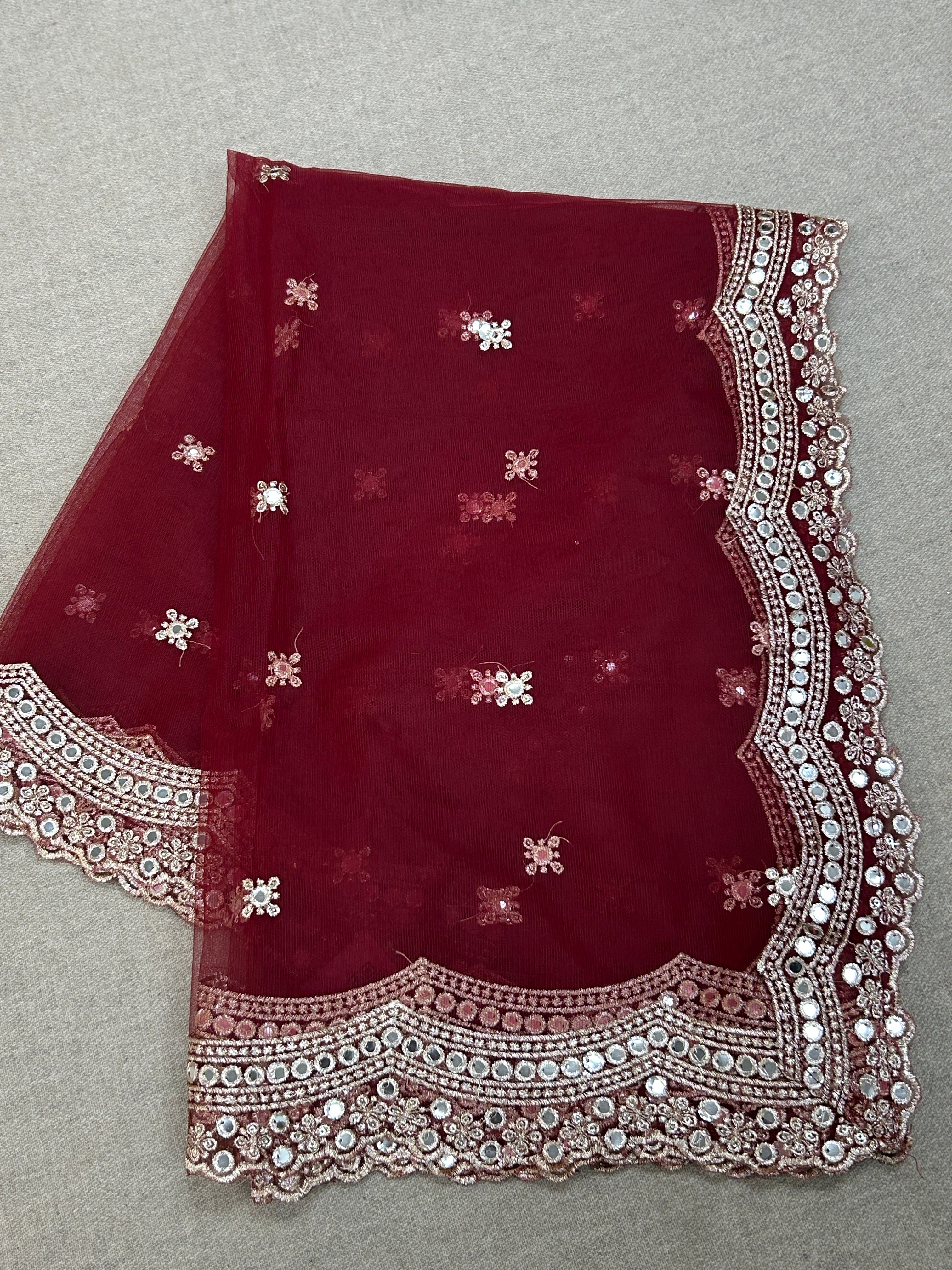 Fancy net dupatta: maroon with light gold work