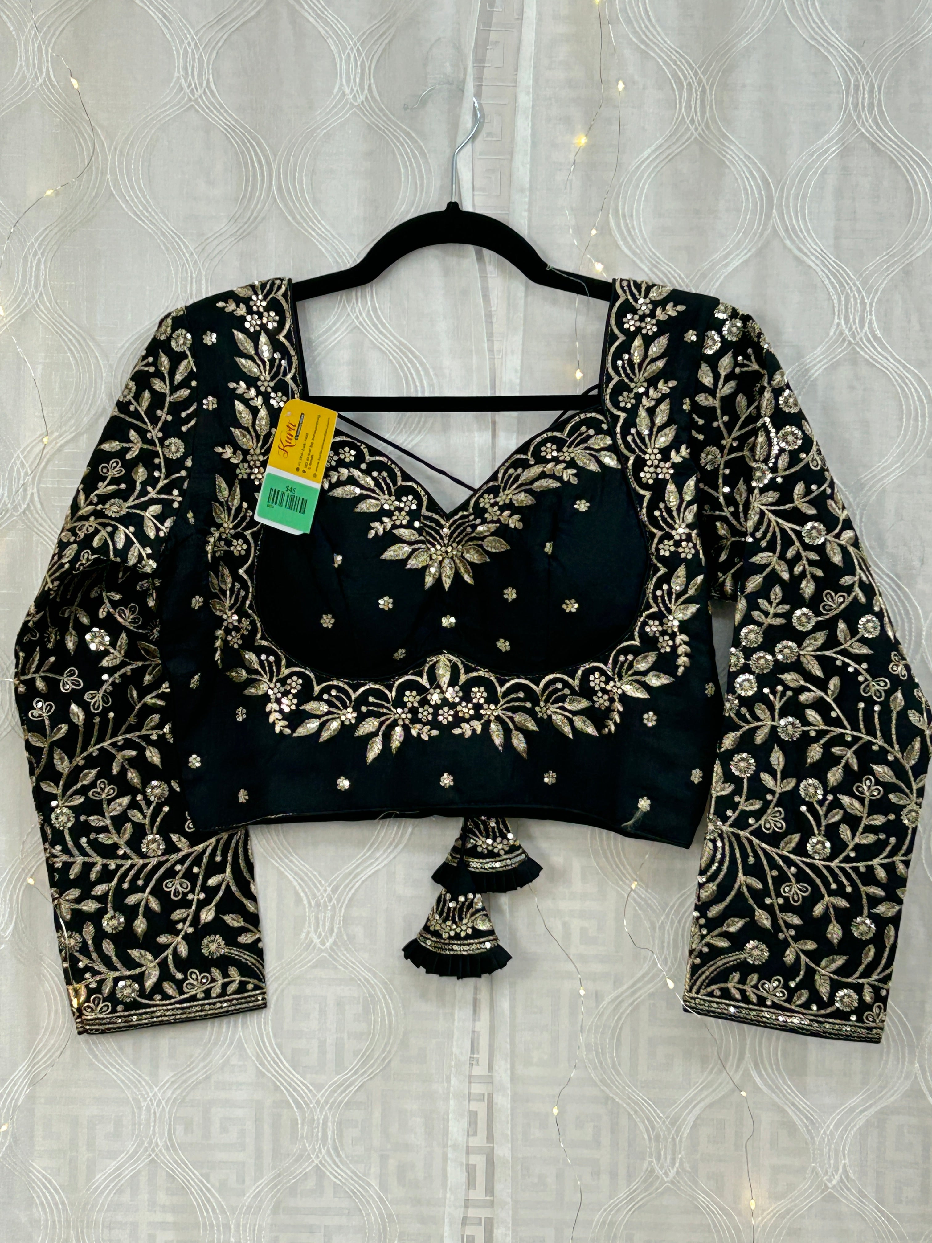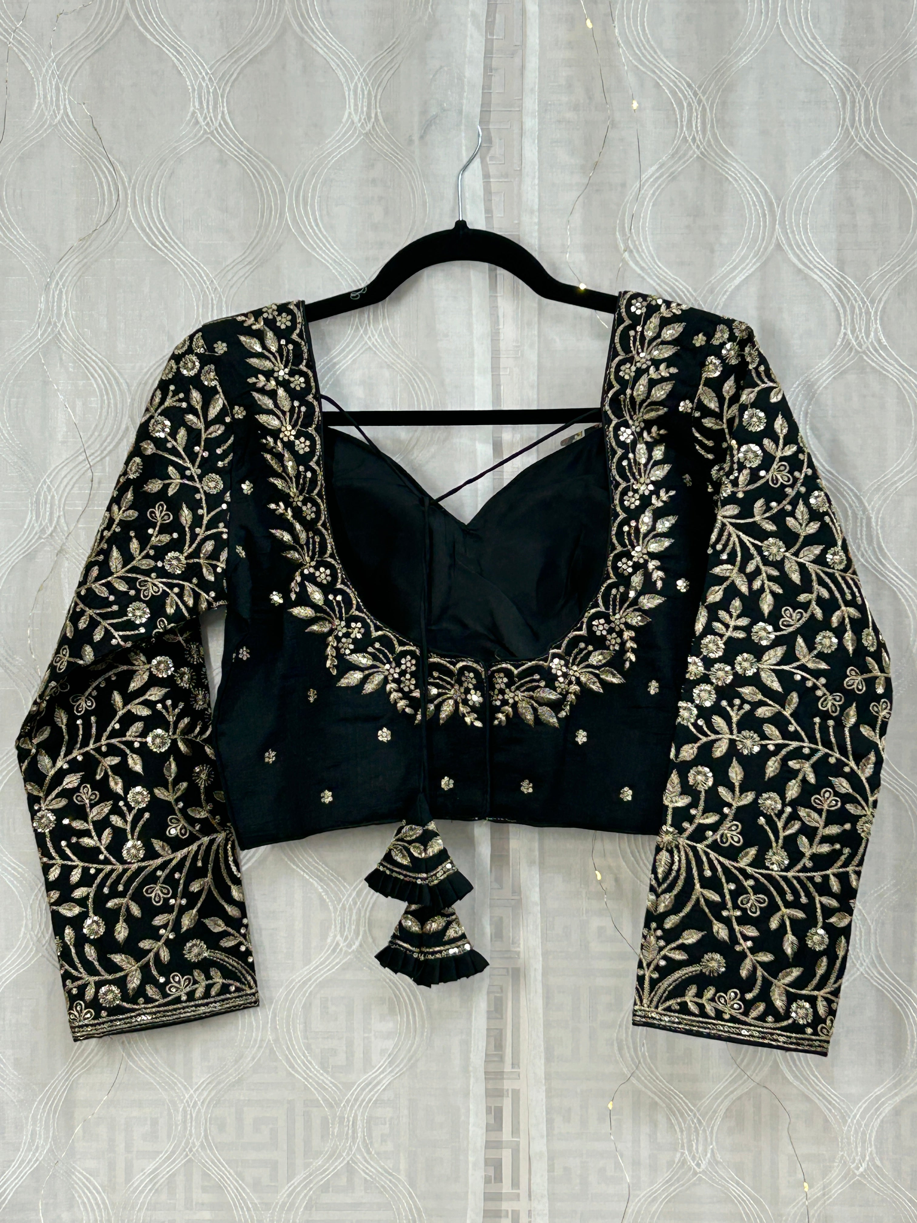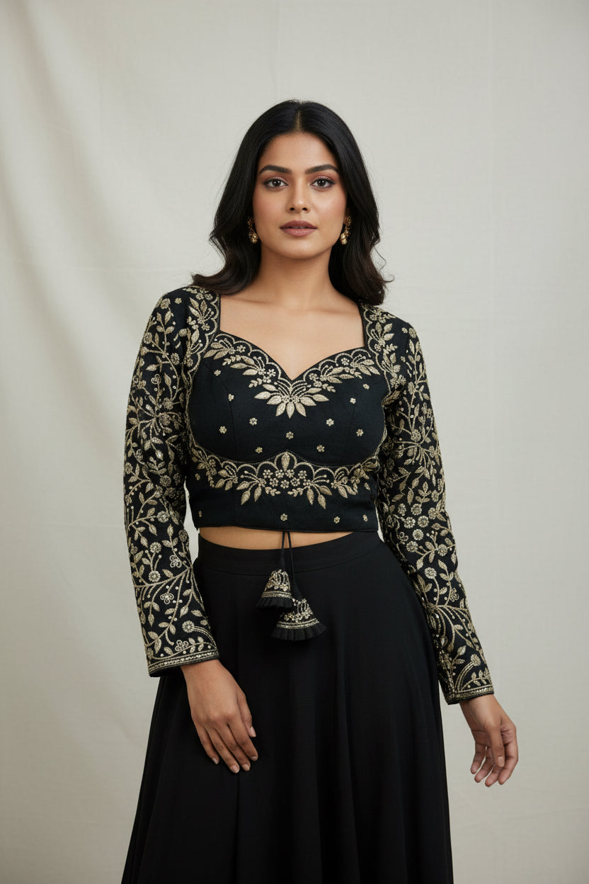 Introducing our Full Sleeve Blouse, featuring the elegant Madhu aka pattern in a sleek black color. Made with high-quality materials, this blouse offers a comfortable fit while adding a touch of sophistication to your wardrobe. Its unique design will make you stand out in any occasion. Upgrade your style with our Full Sleeve Blouse today!