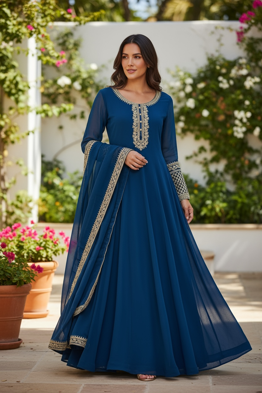 This elegant Georgette dress features a classic Anarkali design, perfect for any party or special occasion. Its flowing silhouette and intricate details are sure to make you stand out. With its timeless style and high-quality fabric, this dress is an essential addition to your wardrobe.