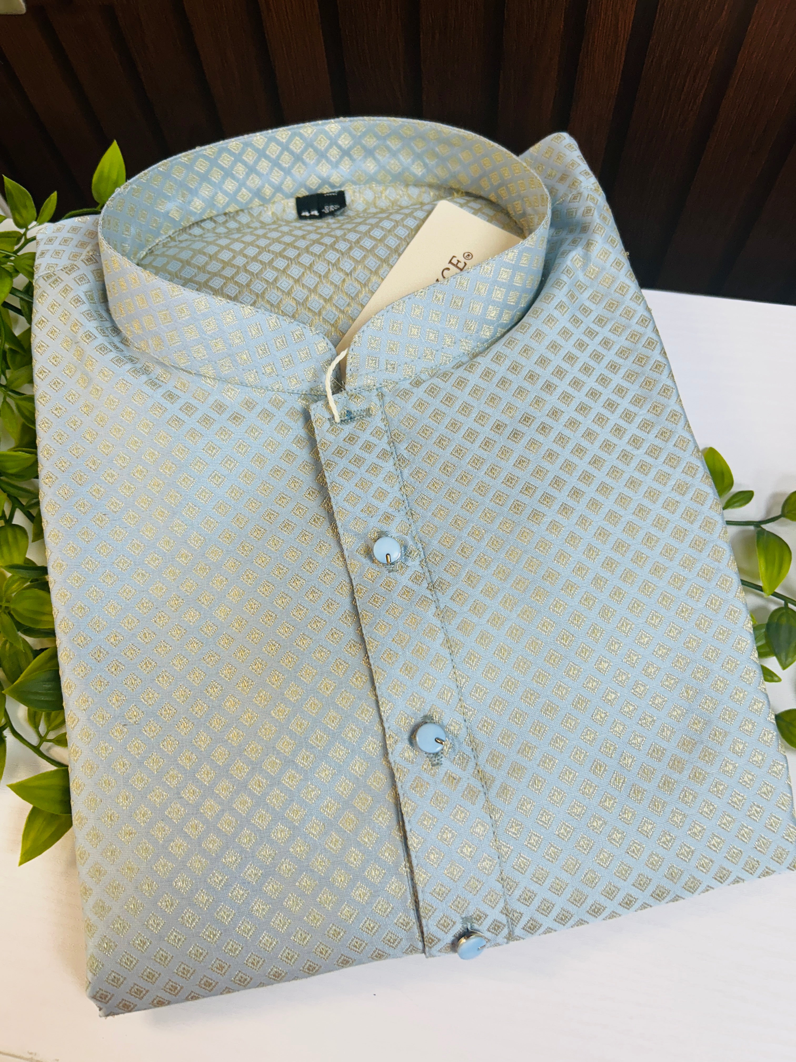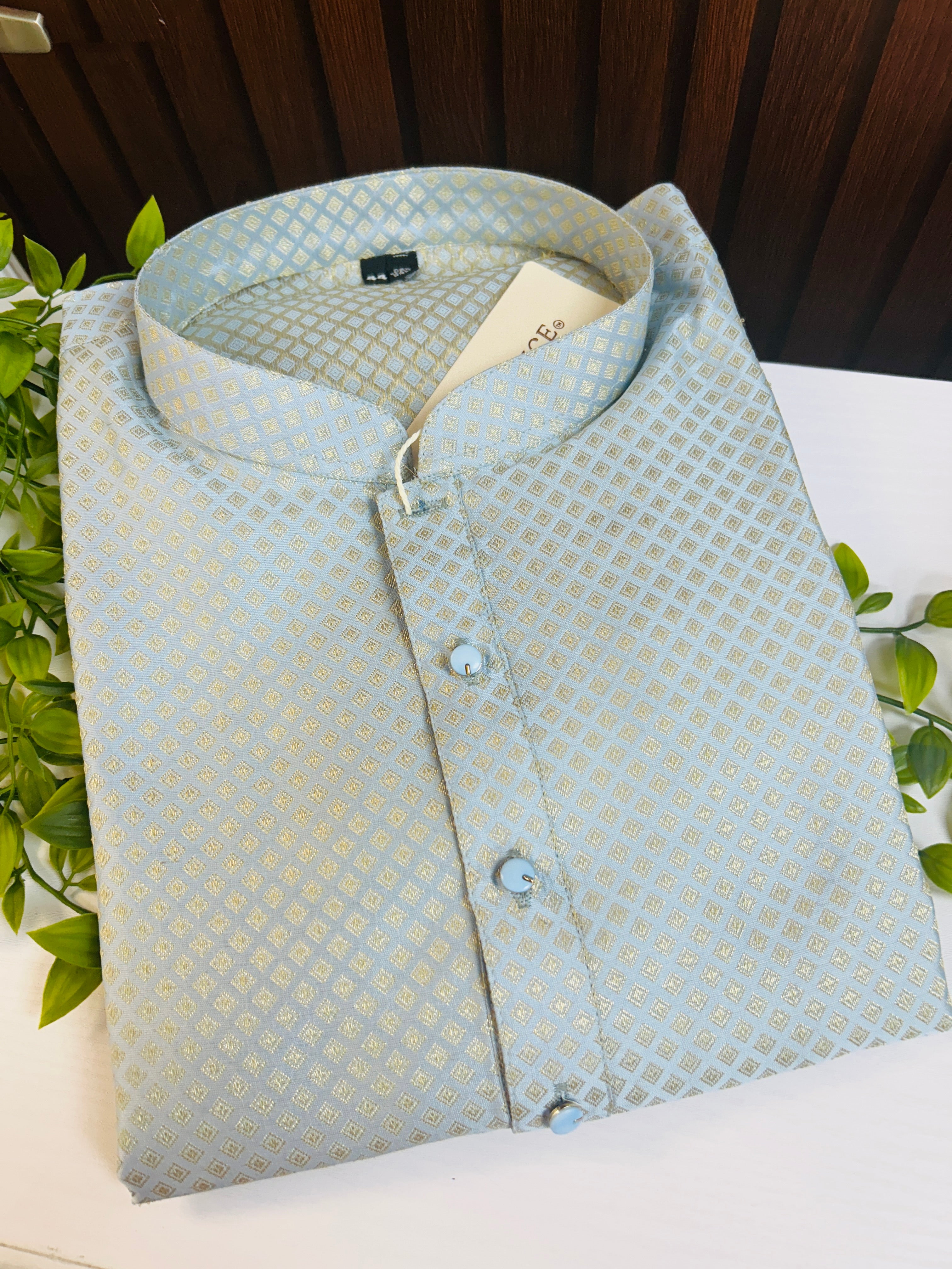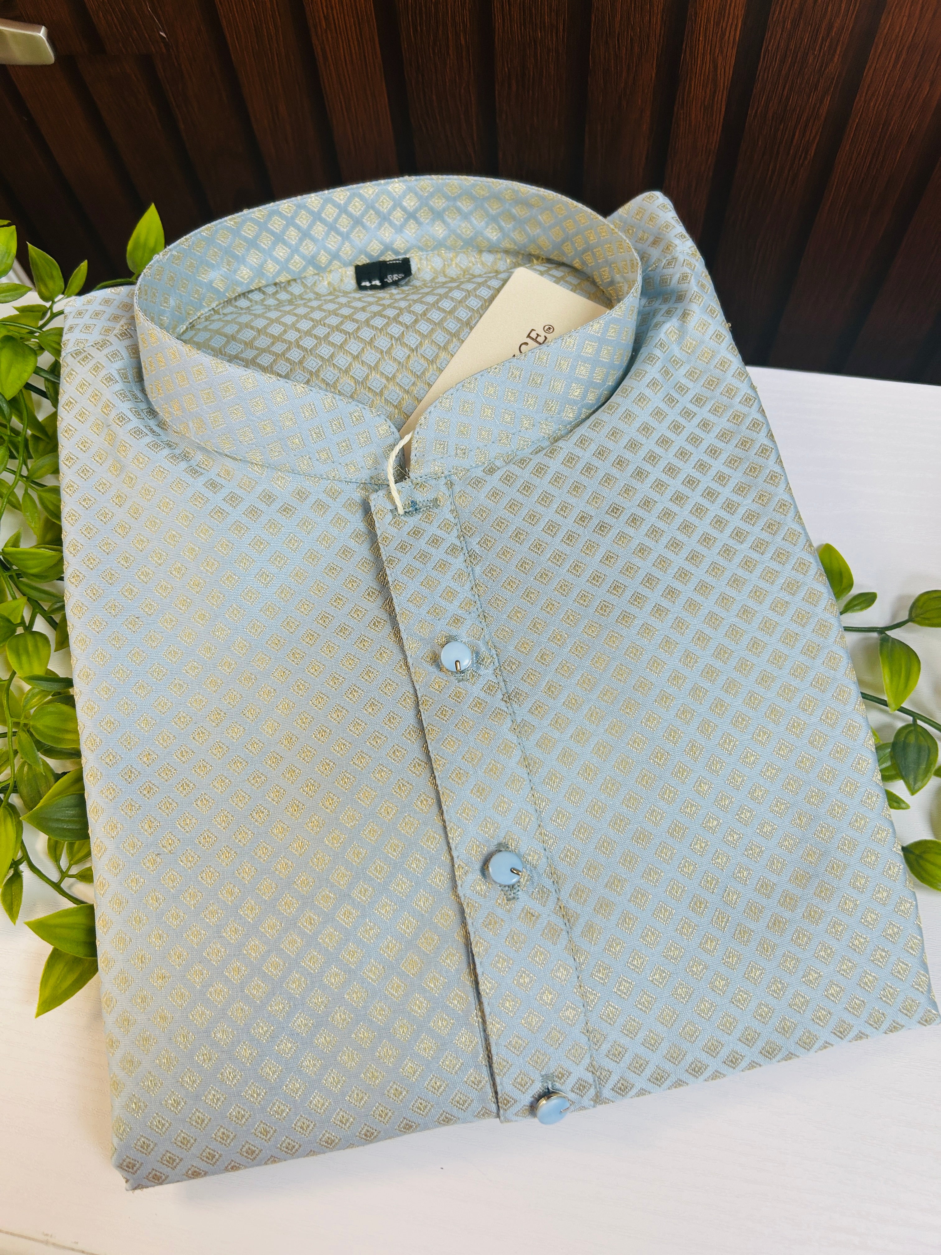 This Grey-GOLD / Silk cotton kurta set for men exudes a truly royal look. The Silk cotton material offers a luxurious feel, while the Grey-GOLD color combination adds a touch of elegance. Perfect for special occasions and formal events, this kurta set will make you stand out in style.Kurta pajama set
