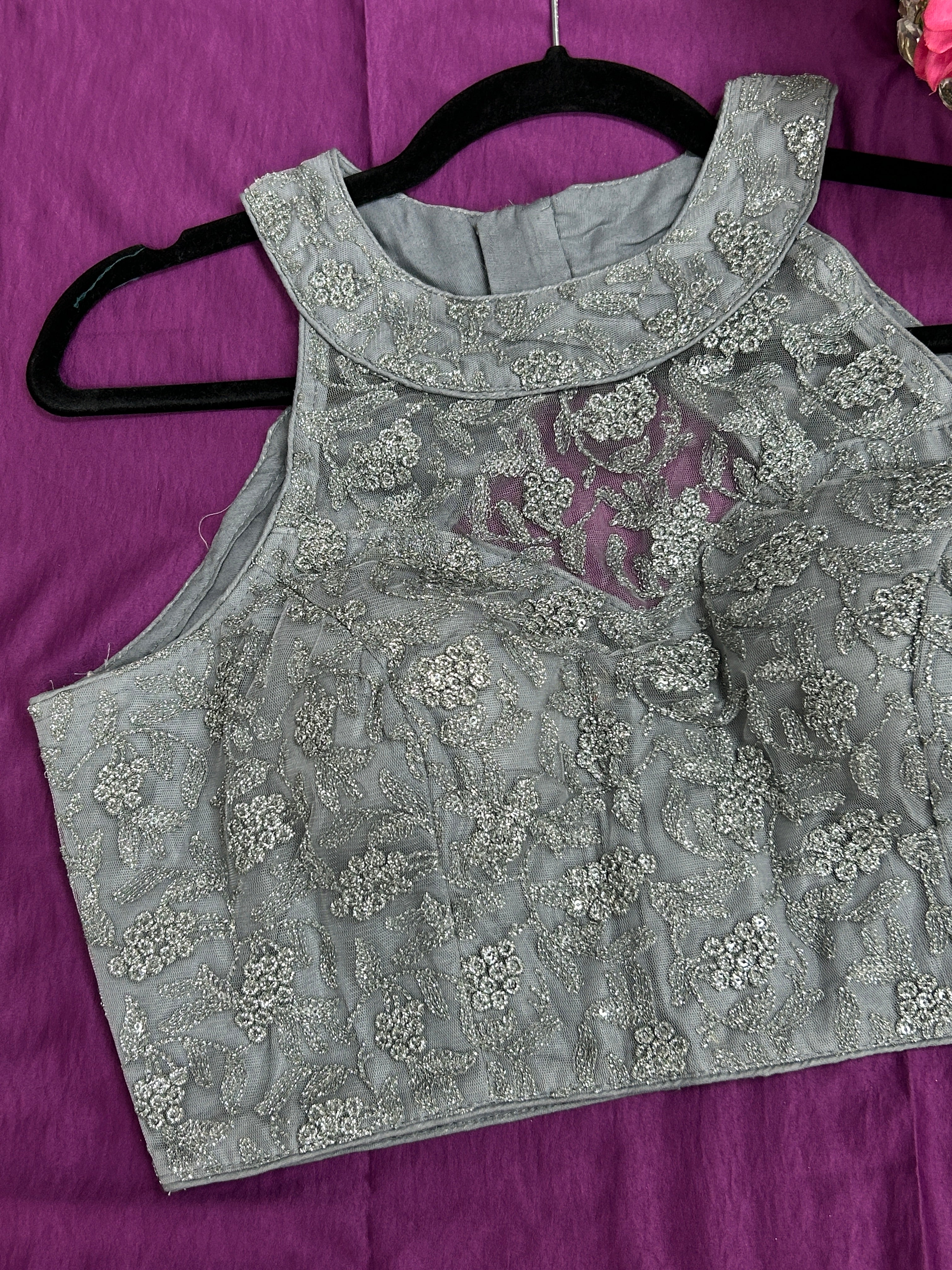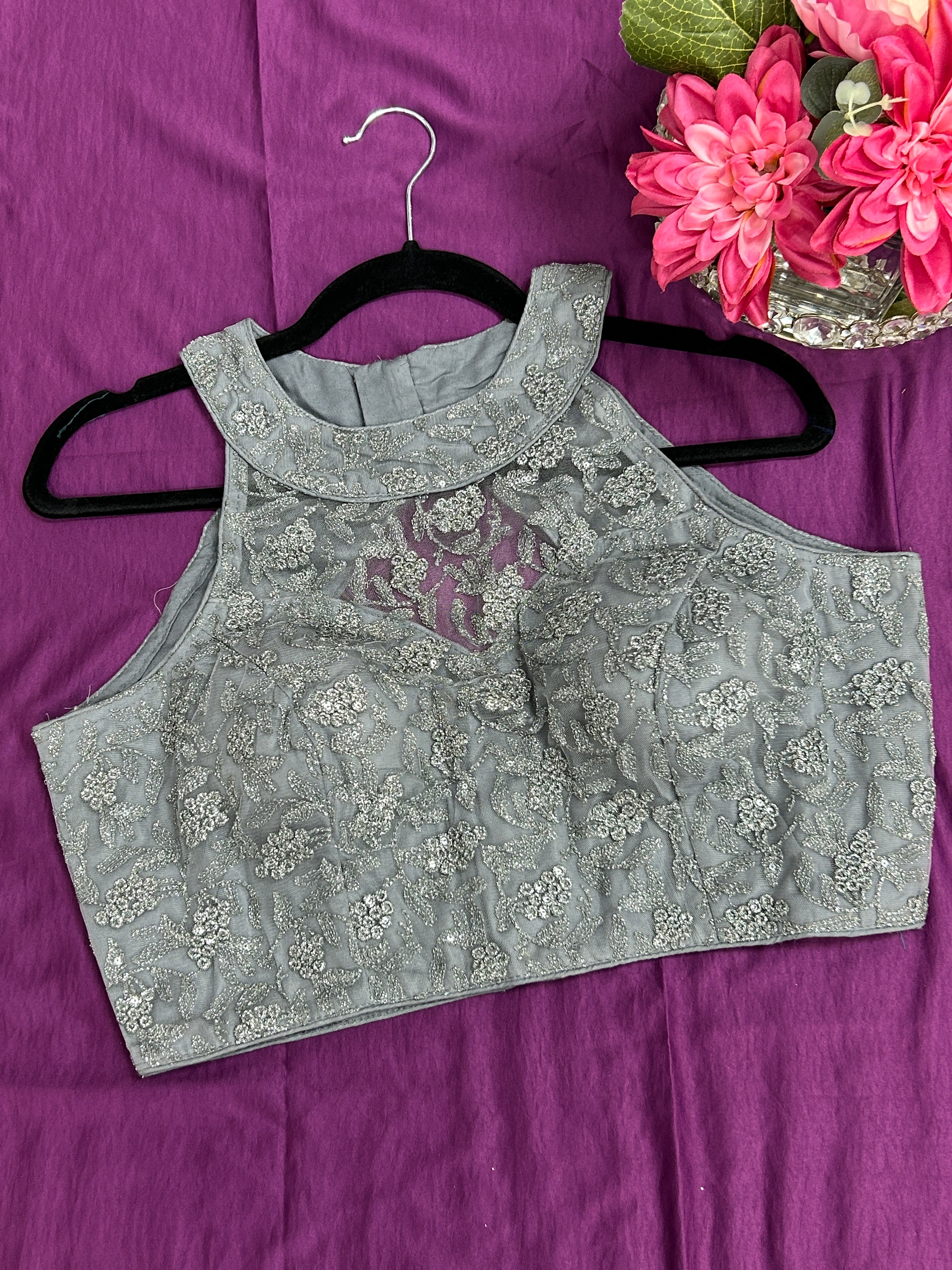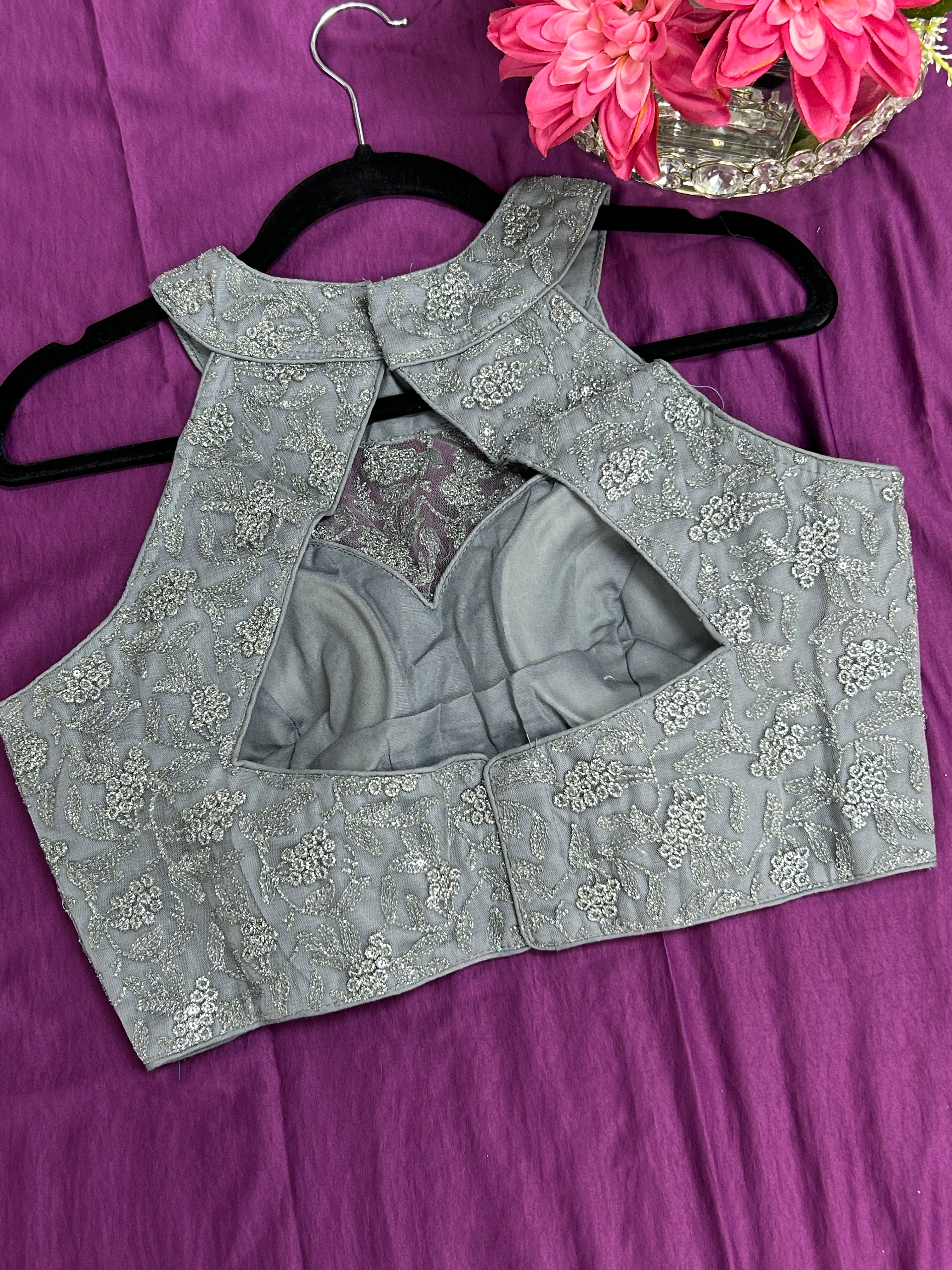 Grey : Halter neck embroidered blouse