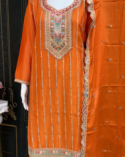 Effortlessly exude elegance and glamour with our Heavy Sharara Suit. Perfect for parties, this gorgeous suit features intricate embroidery and heavy jari work that adds a touch of opulence to any occasion. Command attention and make a statement with our party wear sharara suit.