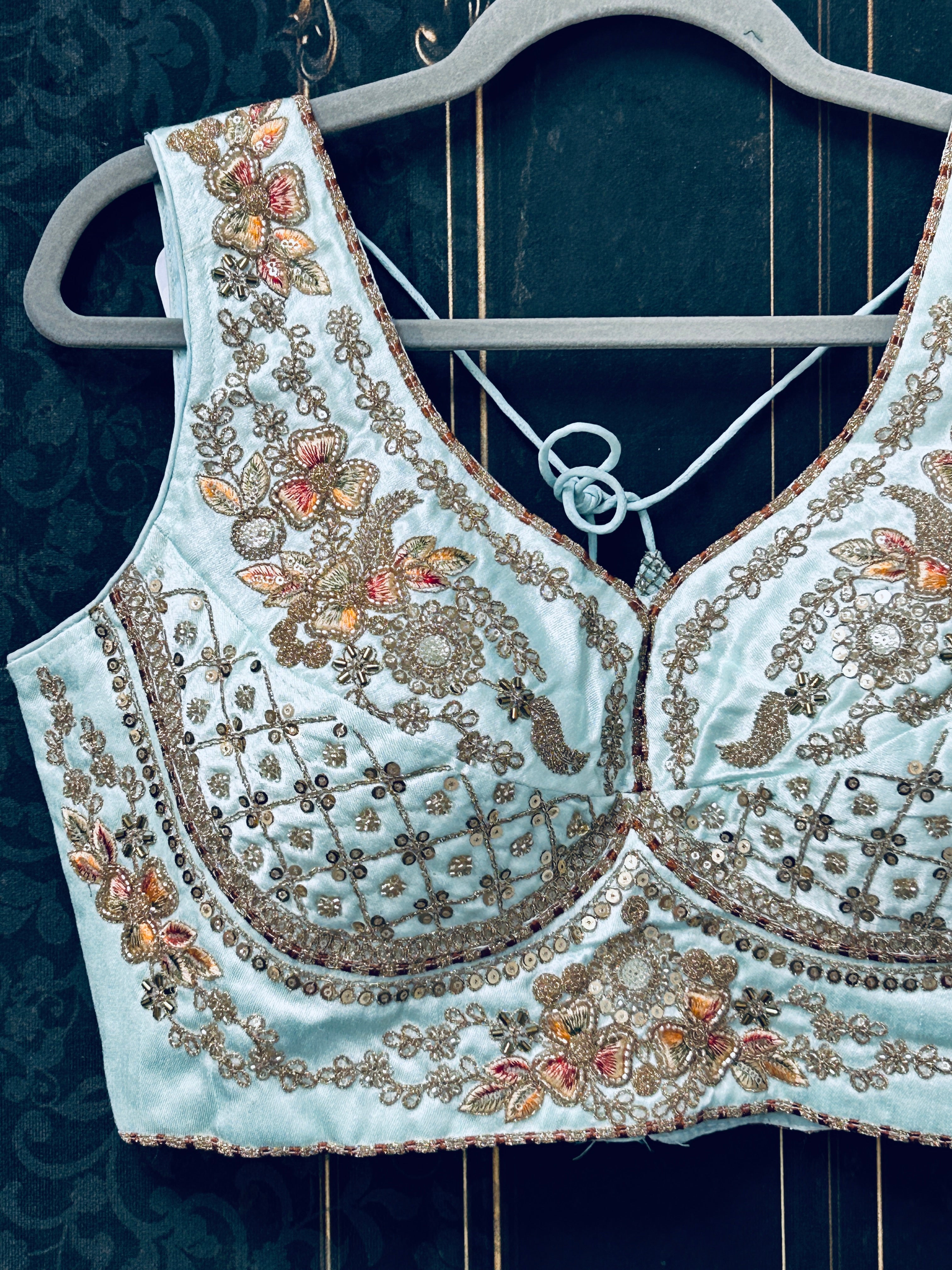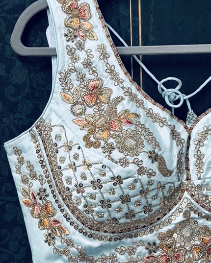 This designer party wear blouse is ready to wear and stitched to perfection. With its heavy work design, it exudes elegance and sophistication, making it the perfect addition to your wardrobe for any special occasion. Experience effortless style and comfort with this stunning blouse.