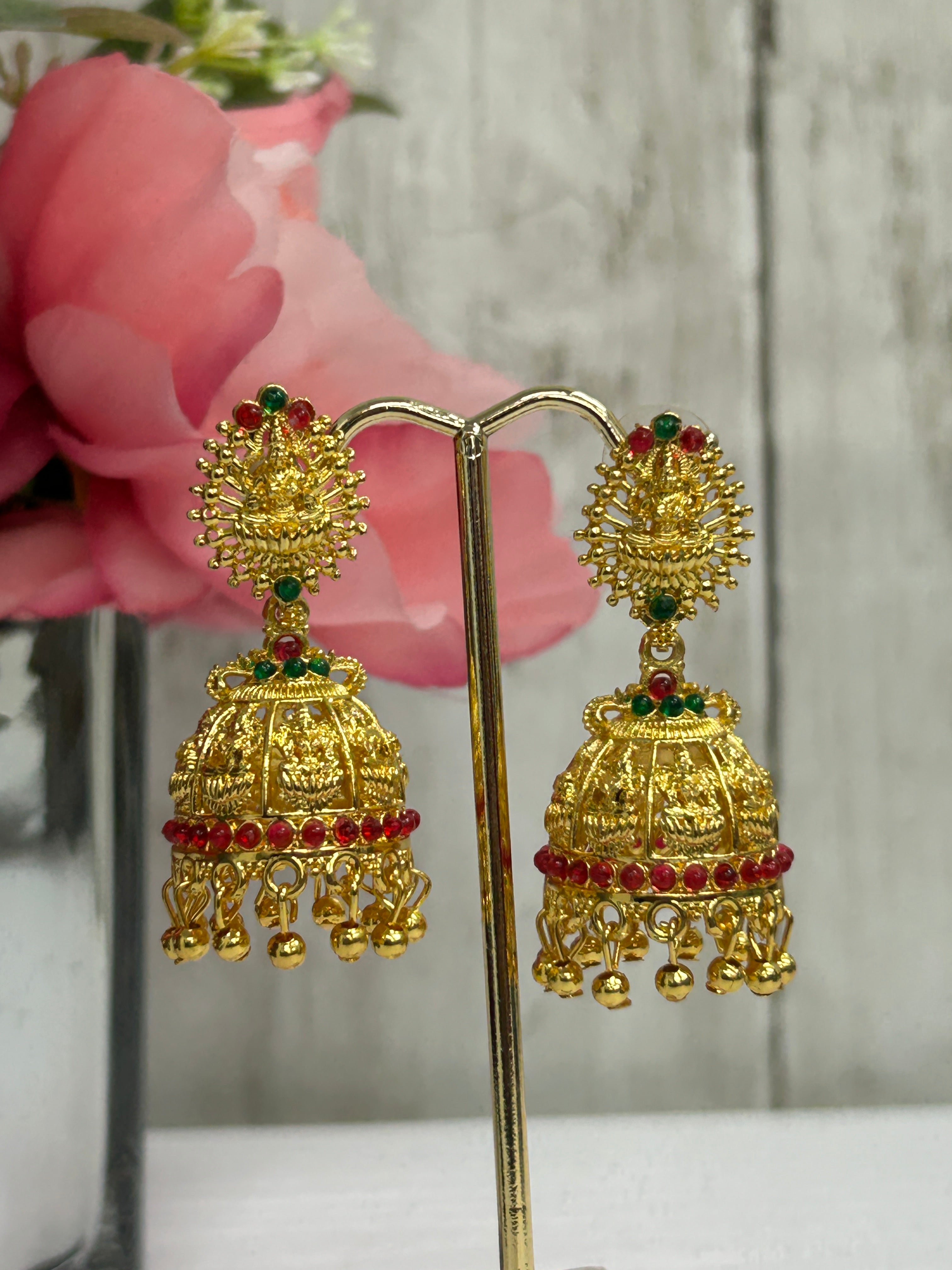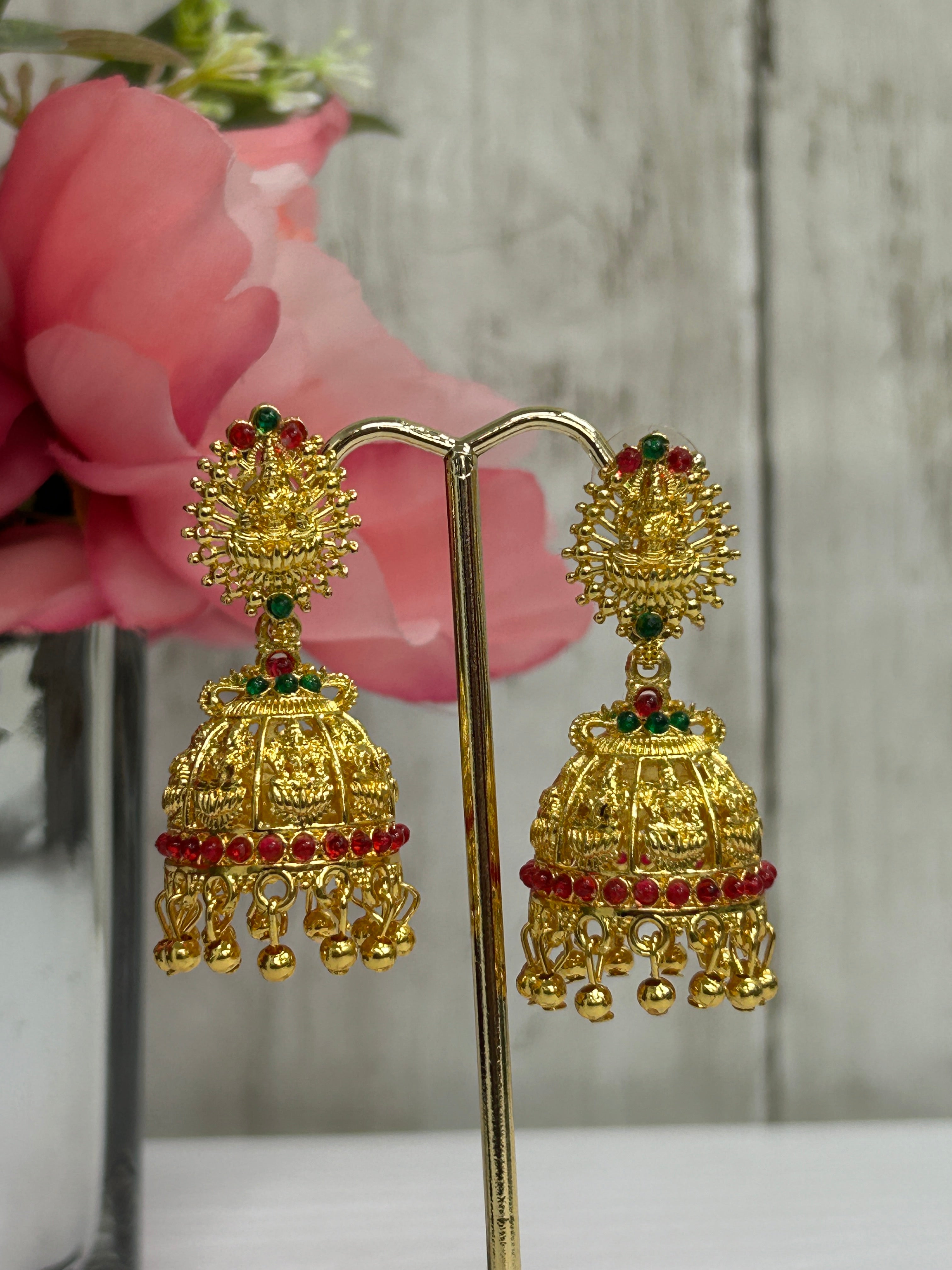 The Lakshmi earrings feature traditional jhumki design, characterized by a bell-shaped structure that offers a graceful aesthetic. Crafted with precision, these earrings enhance cultural attire while providing a secure fit. Ideal for festive occasions, they elevate any ensemble with their elegant silhouette and classic appeal.