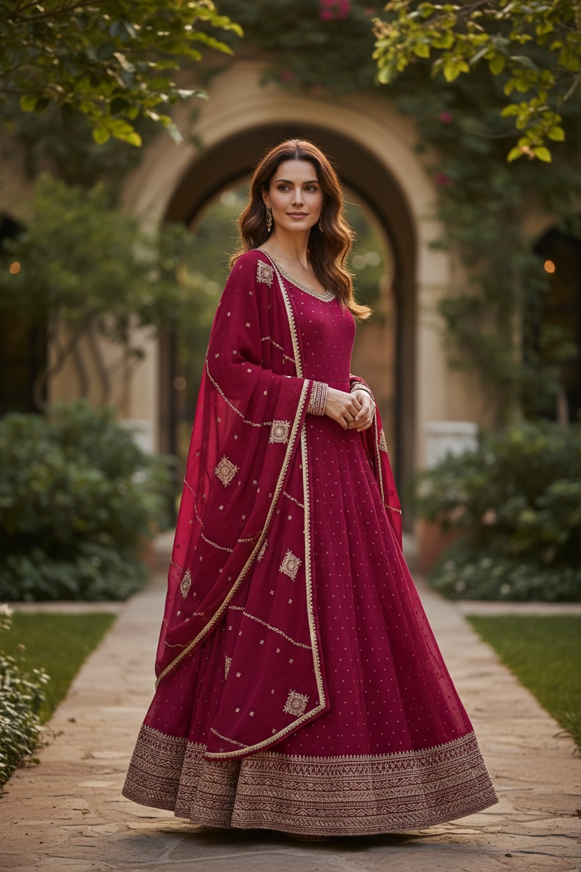 Expertly crafted from luxurious silk, the Leela Anarkali dress combines elegant style and comfort. With a generous 4 inch margin inside, this dress can be easily adjusted to fit sizes 42, 44, and 46. Perfect for any occasion, this dress is a must-have for any fashion-savvy individual.