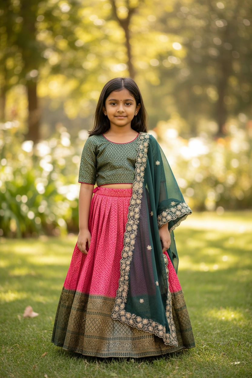 This Lehenga Choli set is designed for girls aged 4. The set includes a traditional Indian lehenga made specifically for kids, providing both comfort and cultural significance. Perfect for traditional events and celebrations.