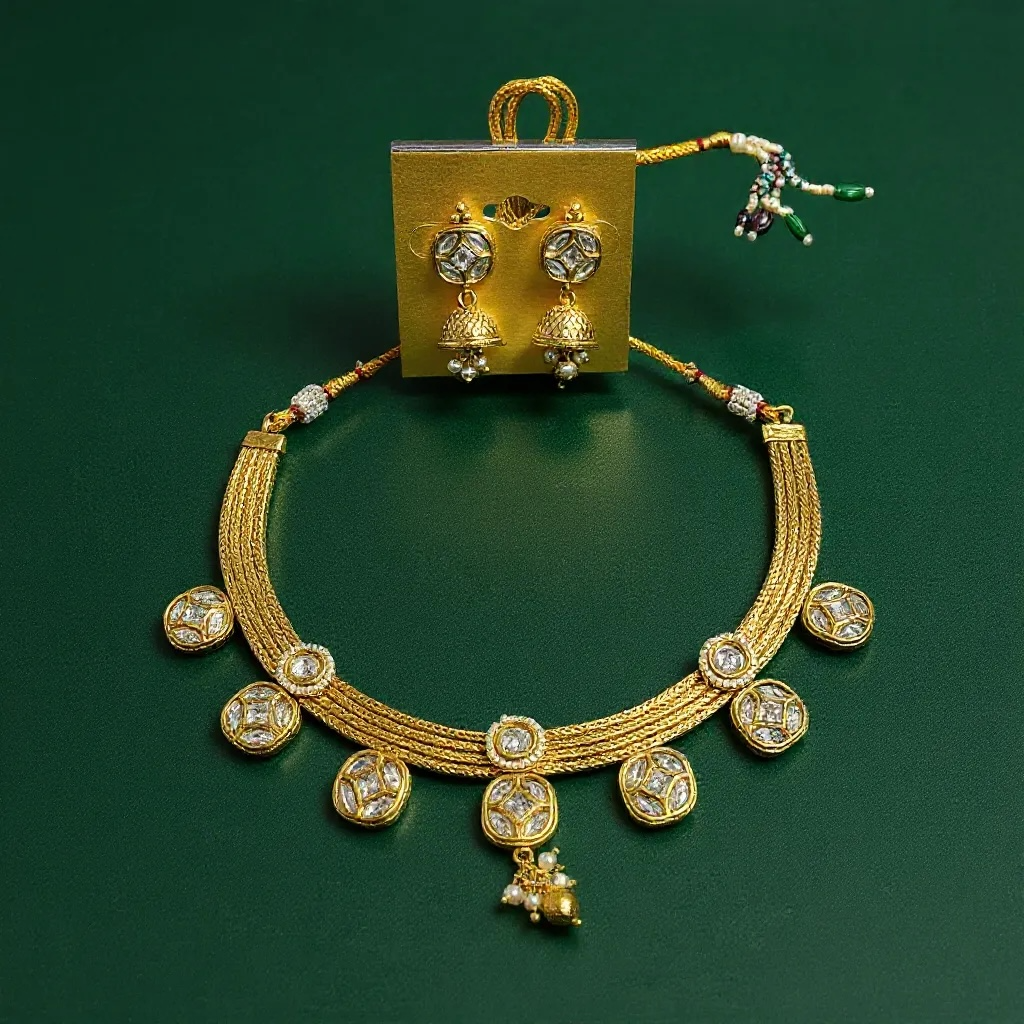 Expertly crafted with Kundan design, this light gold necklace exudes elegance and sophistication. The intricate detailing showcases the high quality craftsmanship, making it a timeless and luxurious addition to any outfit. Elevate your style with this stunning necklace, perfect for any occasion.