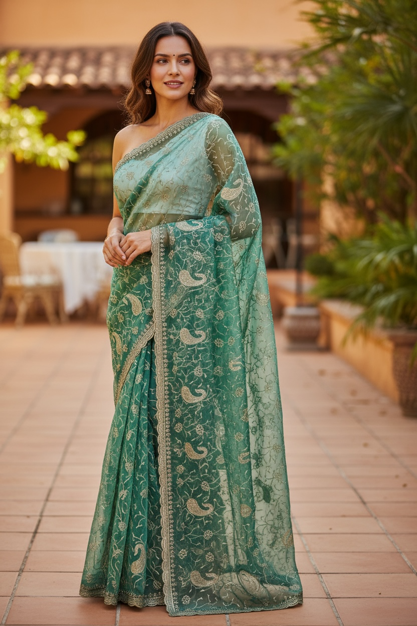 This lightweight tissue silk saree features intricate embroidery, giving it a delicate and elegant look. It comes with a blouse... Read more Read more