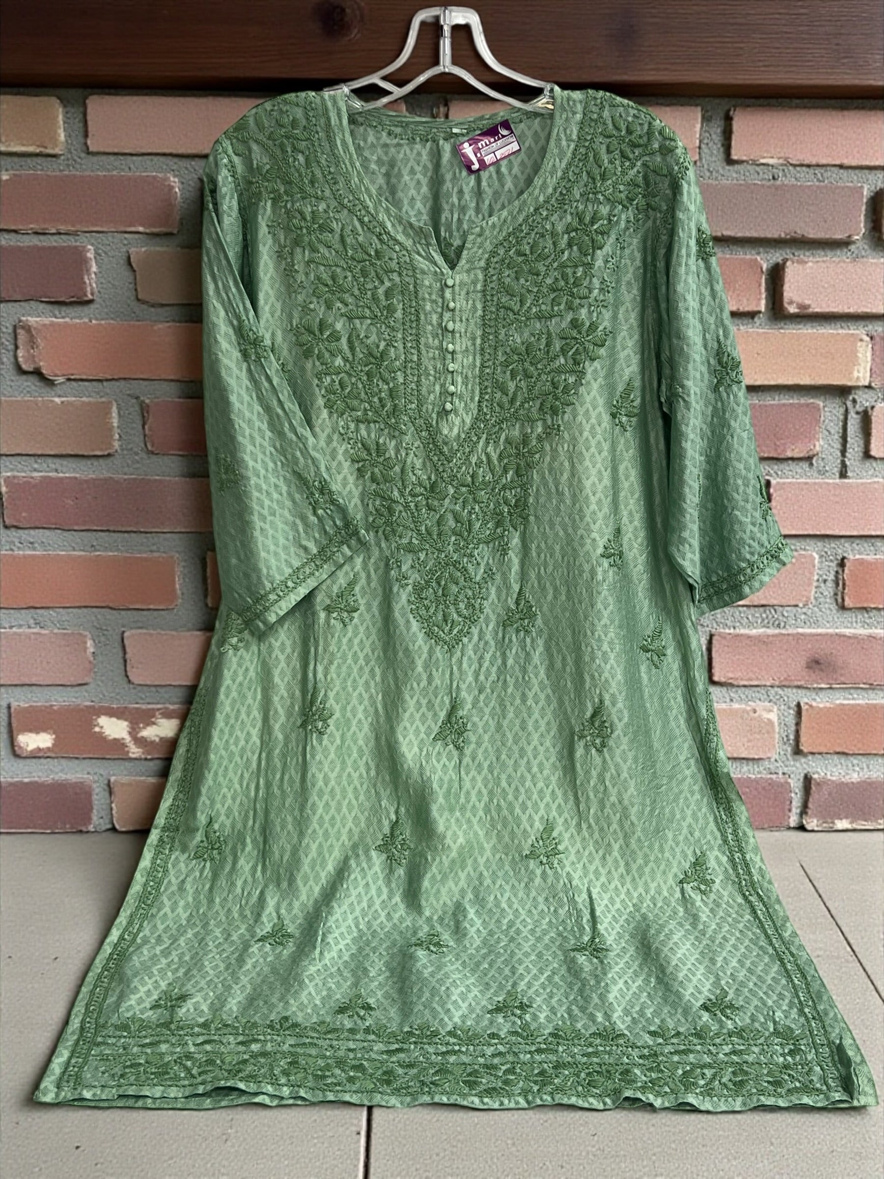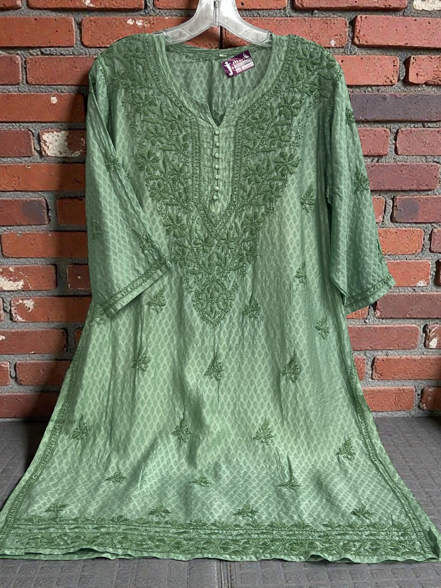 The Lucknow Chikankari Kurti is a handcrafted garment made from modal silk, featuring intricate hand embroidery. This traditional technique, originating from Lucknow, enhances the fabric's aesthetic appeal while maintaining breathability and comfort. The use of modal silk provides a smooth texture and a lightweight feel, making it suitable for various occasions.