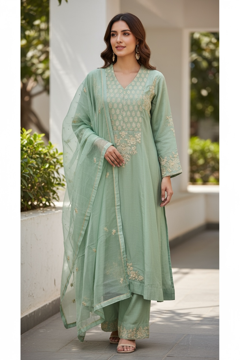 Introducing Mausam, the perfect choice for a heavy party wear Anarkali set. Made from luxurious silk, this set is both beautiful and durable. Elevate your style game and stand out at any event with this stunning Mausam set.