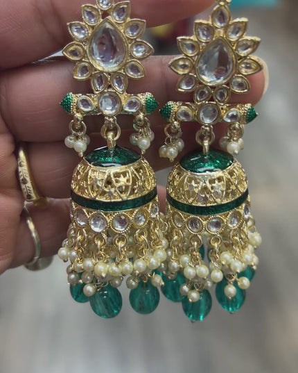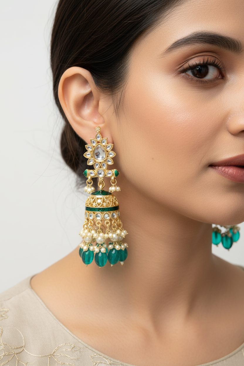 Expertly crafted with traditional Meenakari and Kundan techniques, these Rama green Jhumki earrings radiate elegance and sophistication. The intricate designs and vibrant color are sure to make a statement, perfect for adding a touch of cultural charm to any outfit. Handmade with care, these earrings are a true testament to the artistry and craftsmanship of Indian jewelry.