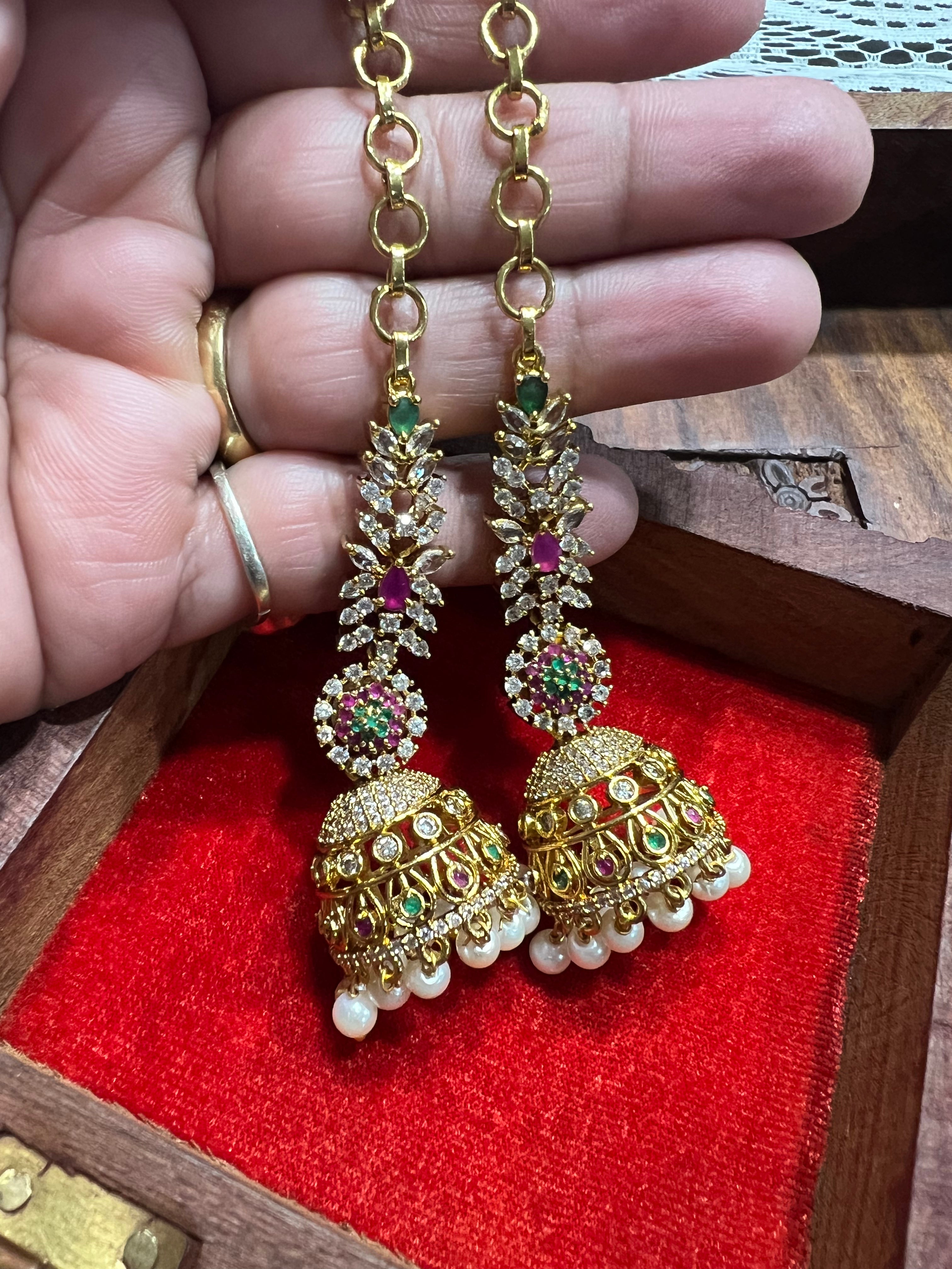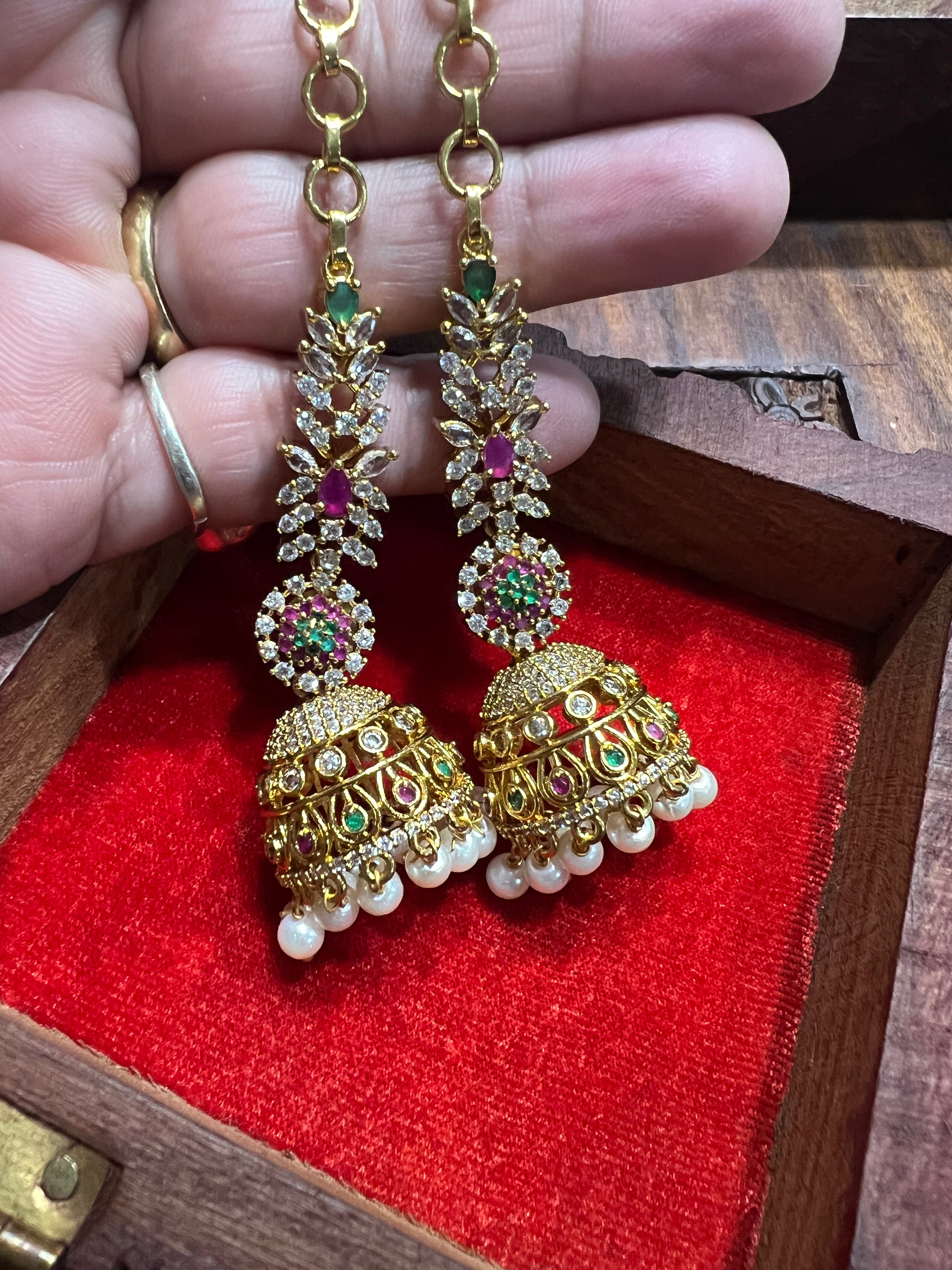 These Mehandi polish long jhumki earrings feature an antique gold finish, adding elegance and charm to any outfit. The Mehandi polish also provides longevity and durability for long-lasting wear. A must-have for any jewelry collection.
