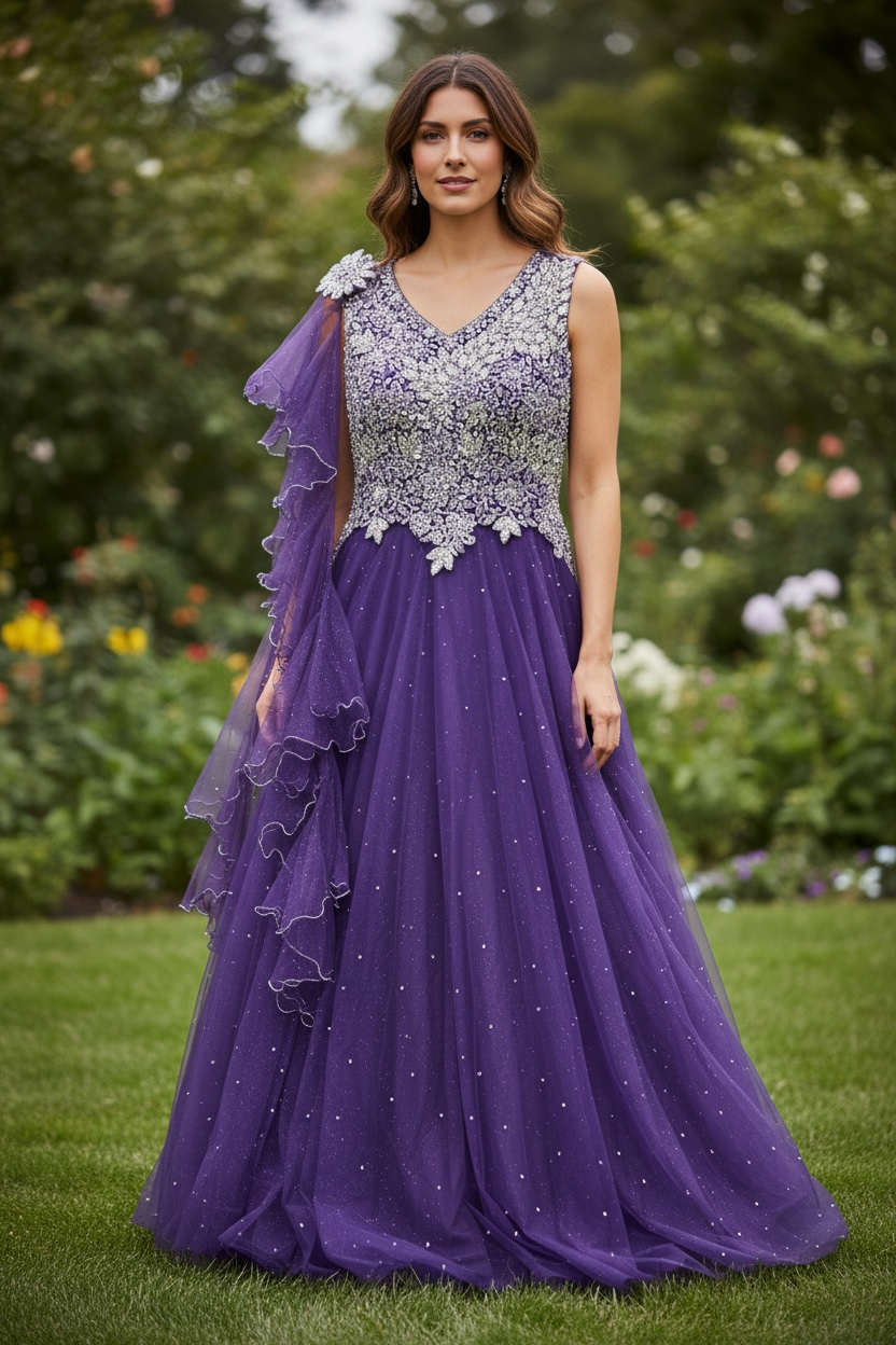 This party wear gown exudes elegance and sophistication. With its long down design, it provides full coverage and adds a touch of glamour. Perfect for formal events, this gown is sure to make a statement and leave a lasting impression.