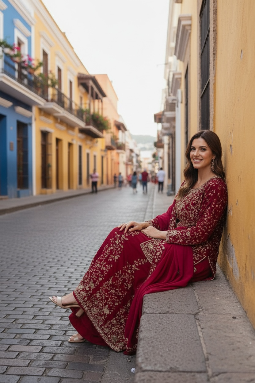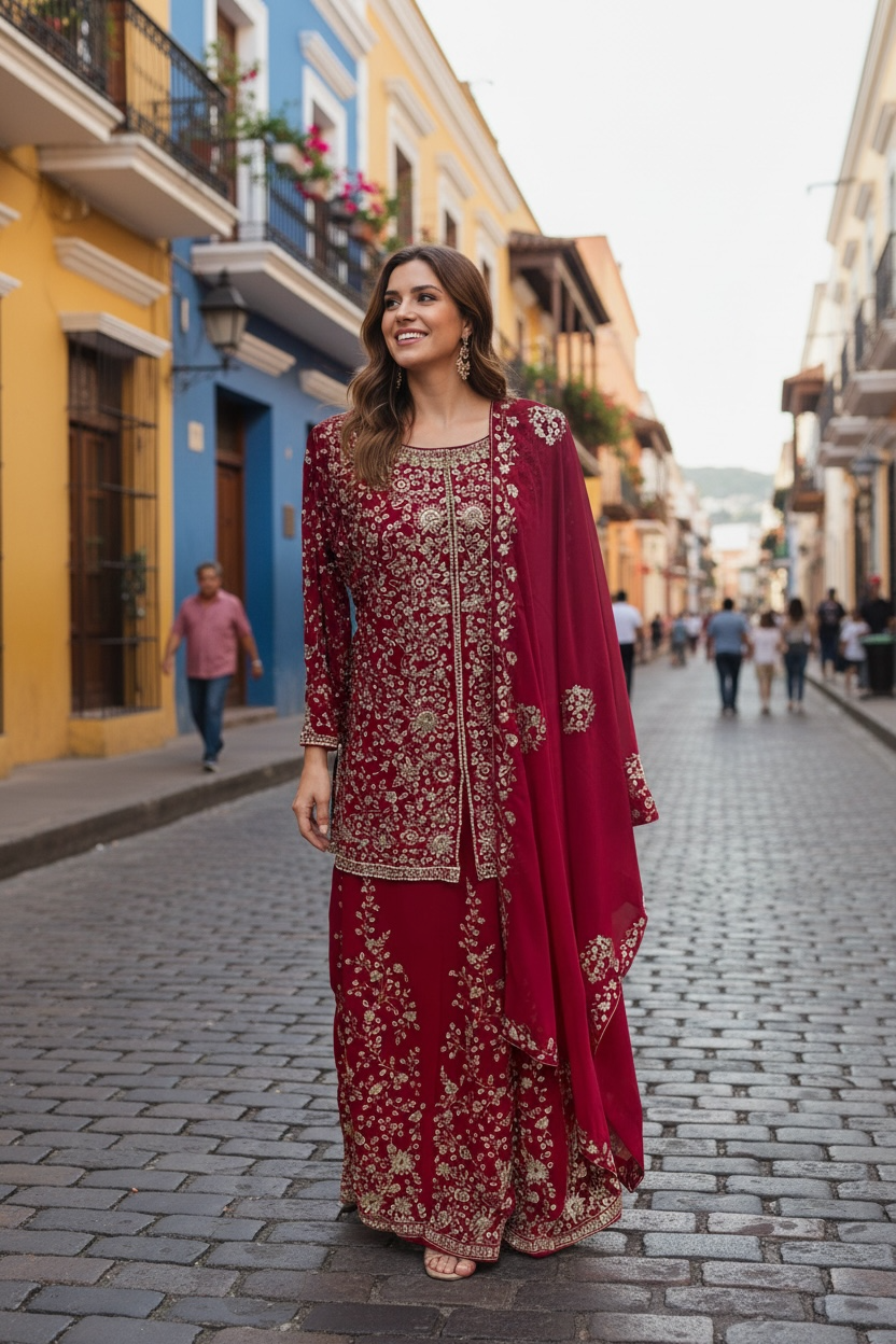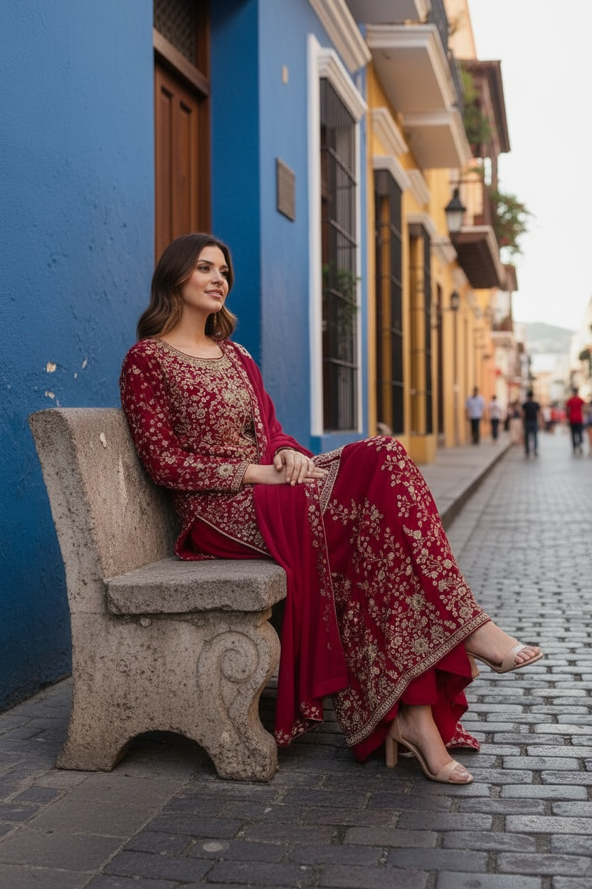 Add elegance to your wardrobe with our Party Wear Sharara Set. Featuring heavy embroidery work, this set is perfect for any wedding guest looking to make a statement. Elevate your style with this luxurious and sophisticated ensemble.