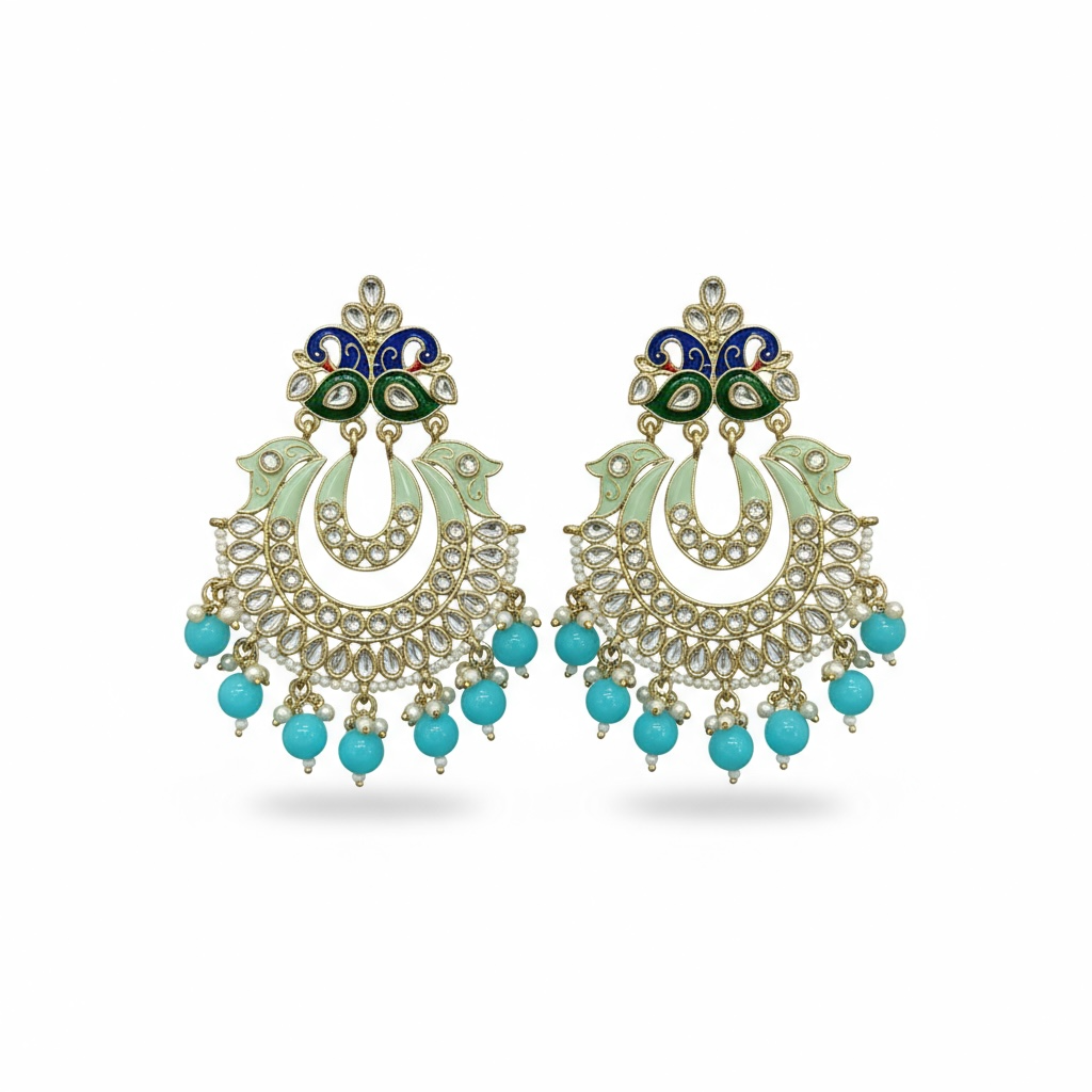 Add a touch of elegance with our Peacock Chandbali earrings. These stunning earrings feature intricate designs and are sure to make a statement. Handcrafted with care, they are the perfect accessory for any special occasion. Elevate your style today with our beautiful Peacock Chandbali earrings.