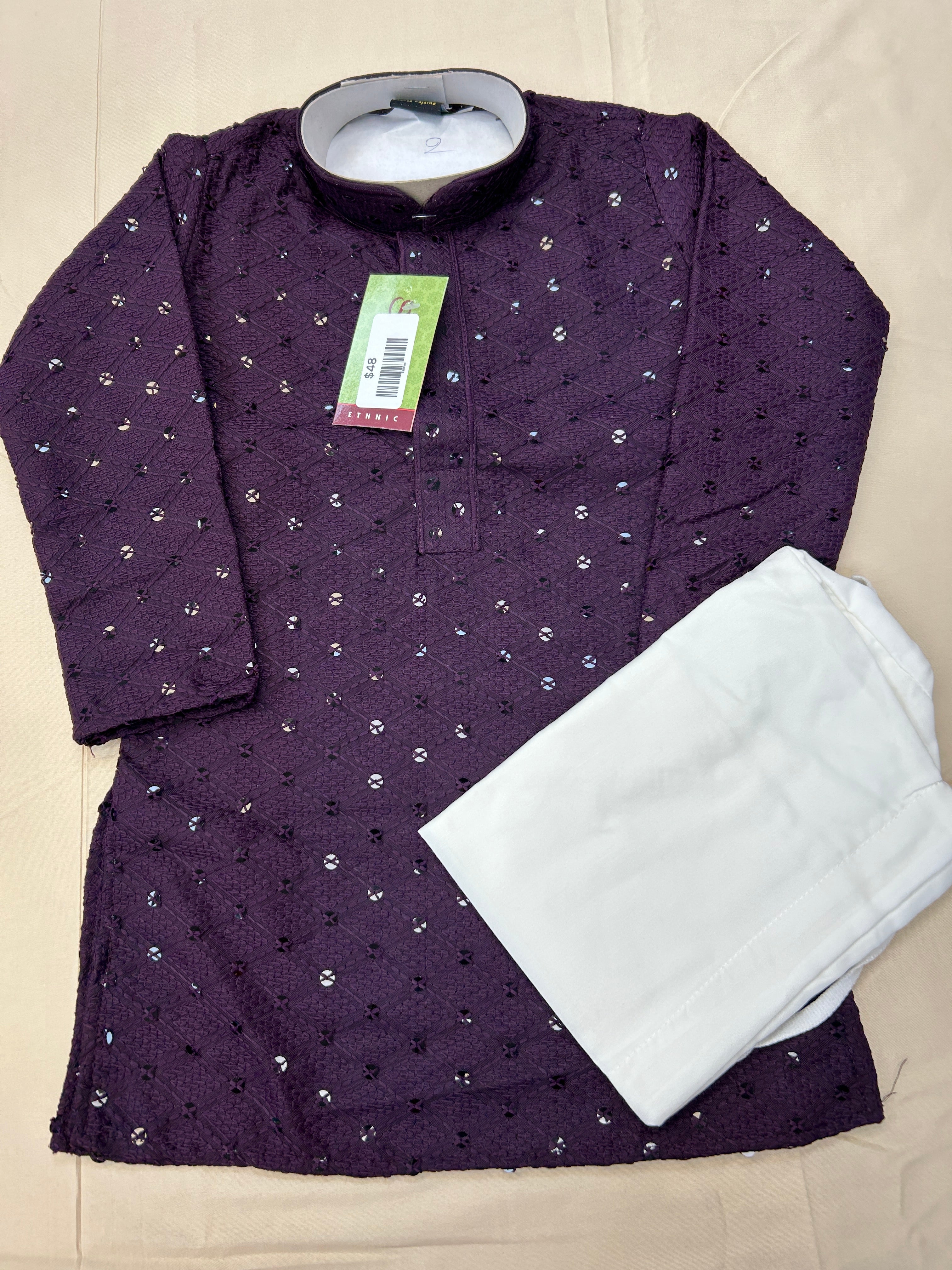 Introduce your child to the world of traditional Indian fashion with our Sequin Kurta Set in vibrant purple. Made specifically for boys, this set includes a stylish kids kurta that is perfect for any formal occasion. With sequin detailing, your child will stand out in the crowd while feeling comfortable and confident.