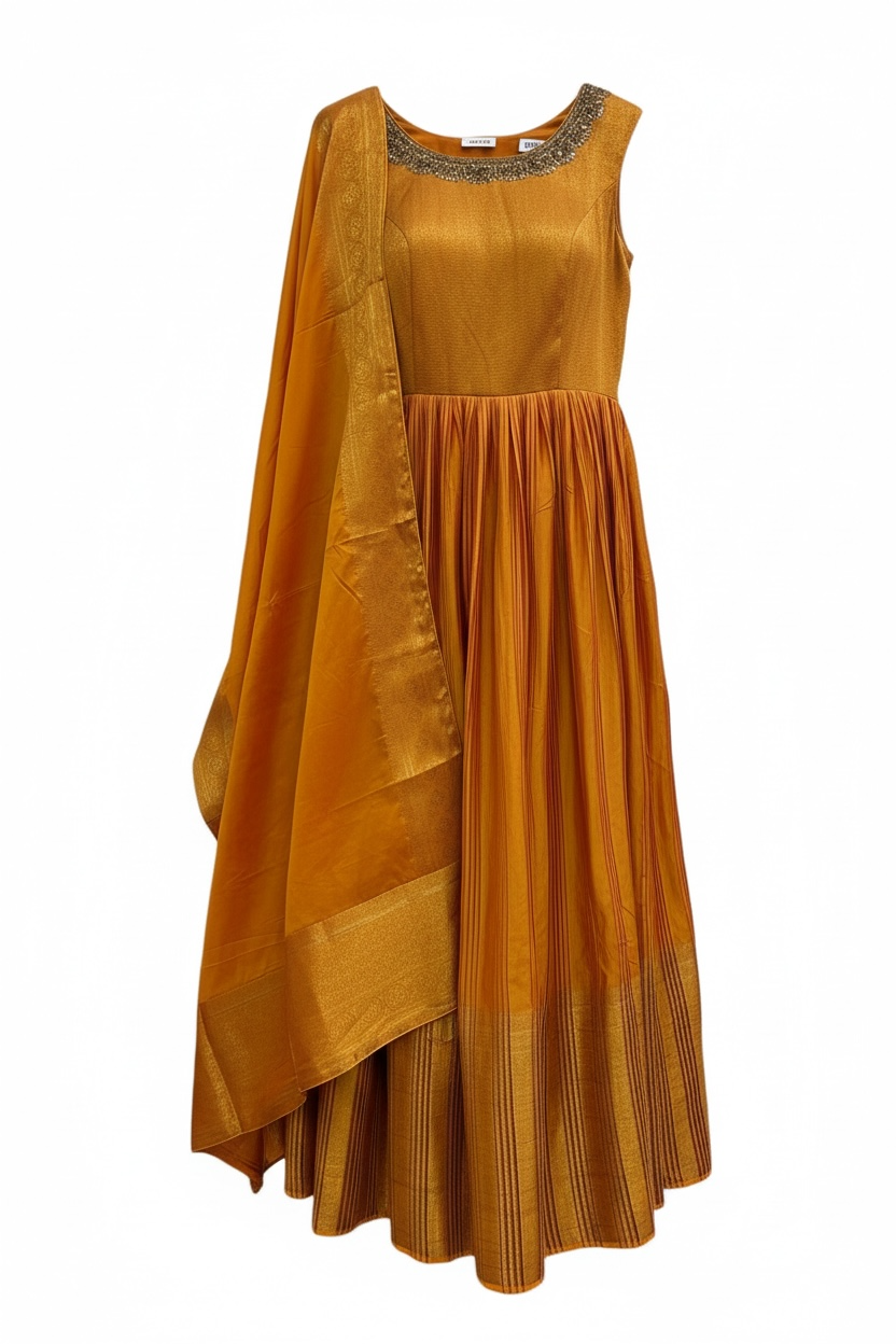 This Silk Anarkali suit features elegant three fourth sleeves that add to its timeless and sophisticated design. Experience the comfort and style of this traditional Indian garment, perfect for any occasion.