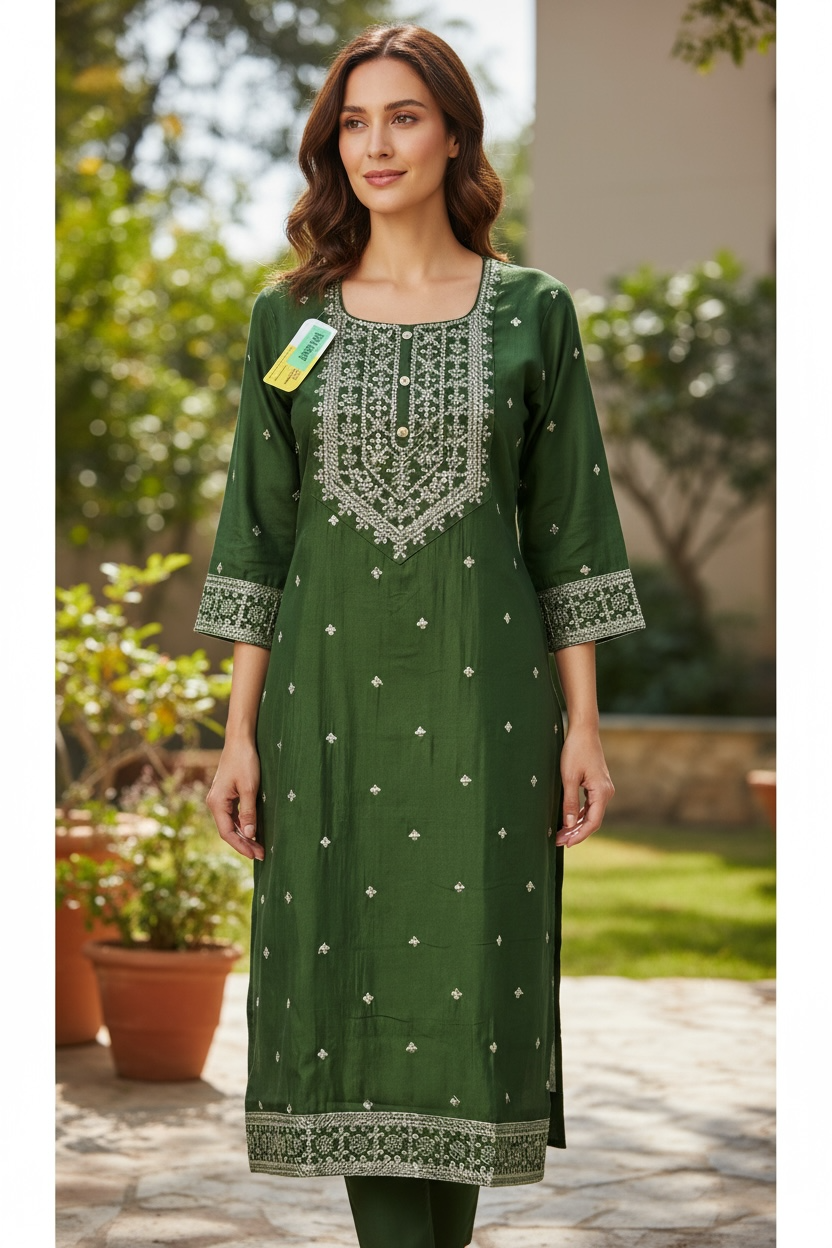 This green silk kurti is designed with a lining, providing a luxurious and comfortable feel. Perfect for any occasion, this kurti offers a smooth and elegant look while keeping you cool and comfortable. Elevate your wardrobe with this versatile and stylish piece.