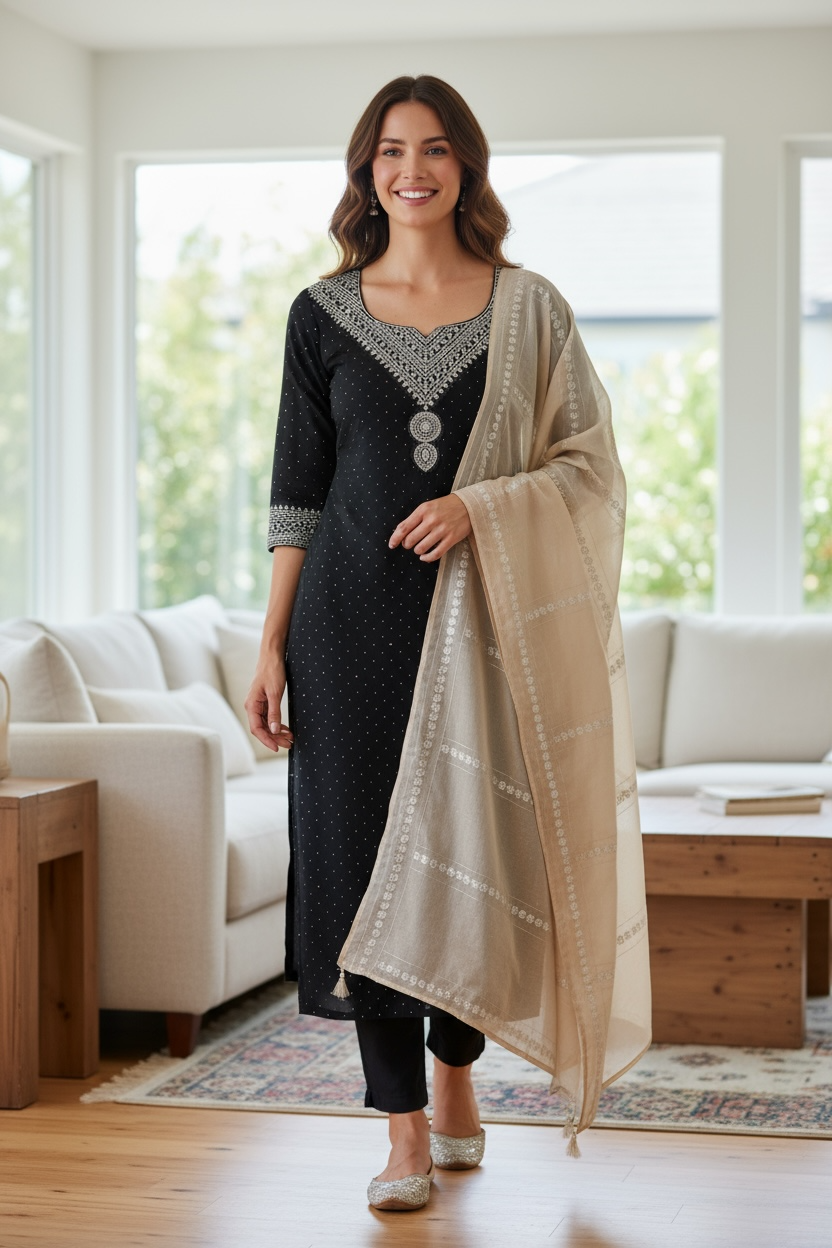 Product form Silk kurti set $85.00 Salwar suit Read more Read more Free pickup in our shop(s) Color Black Size 38/ US XS 40 (US SMALL ) 42 (US M) 44 (US LARGE) Barcode: 72609381 1 in stock Show extra info for delivery time Add to cart This item is a recurring or deferred purchase. By continuing, I agree to the cancellation policy and authorize you to charge my payment method at the prices, frequency and dates listed on this page until my order is fulfilled or I cancel, if permitted. Shipped today? Order within: Oct 18, 2025 17:00:00 -0500 Reviews 0 reviews Share with your friends Share WhatsApp Deel X Pin it Messenger Email Need help with your size? Size finder Description Salwar suit