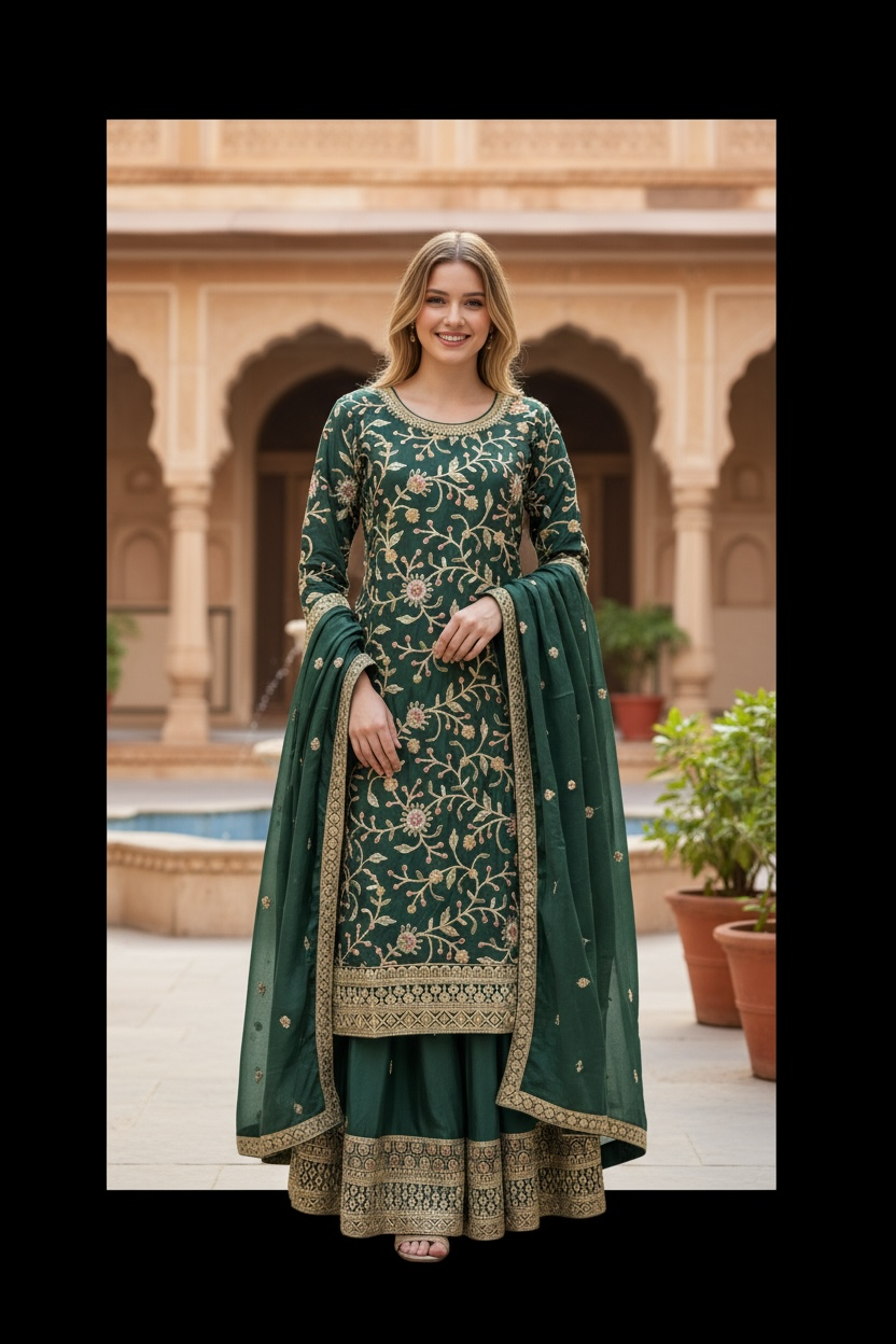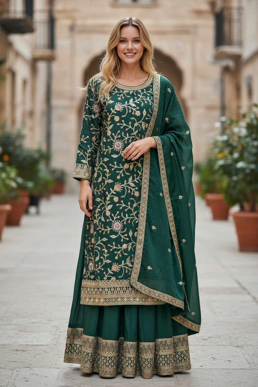 This elegant silk sharara suit is the perfect choice for any wedding party. Made from luxurious silk, it offers a sophisticated and stylish look. Elevate your style and make a statement with this stunning piece, perfect for any special occasion.