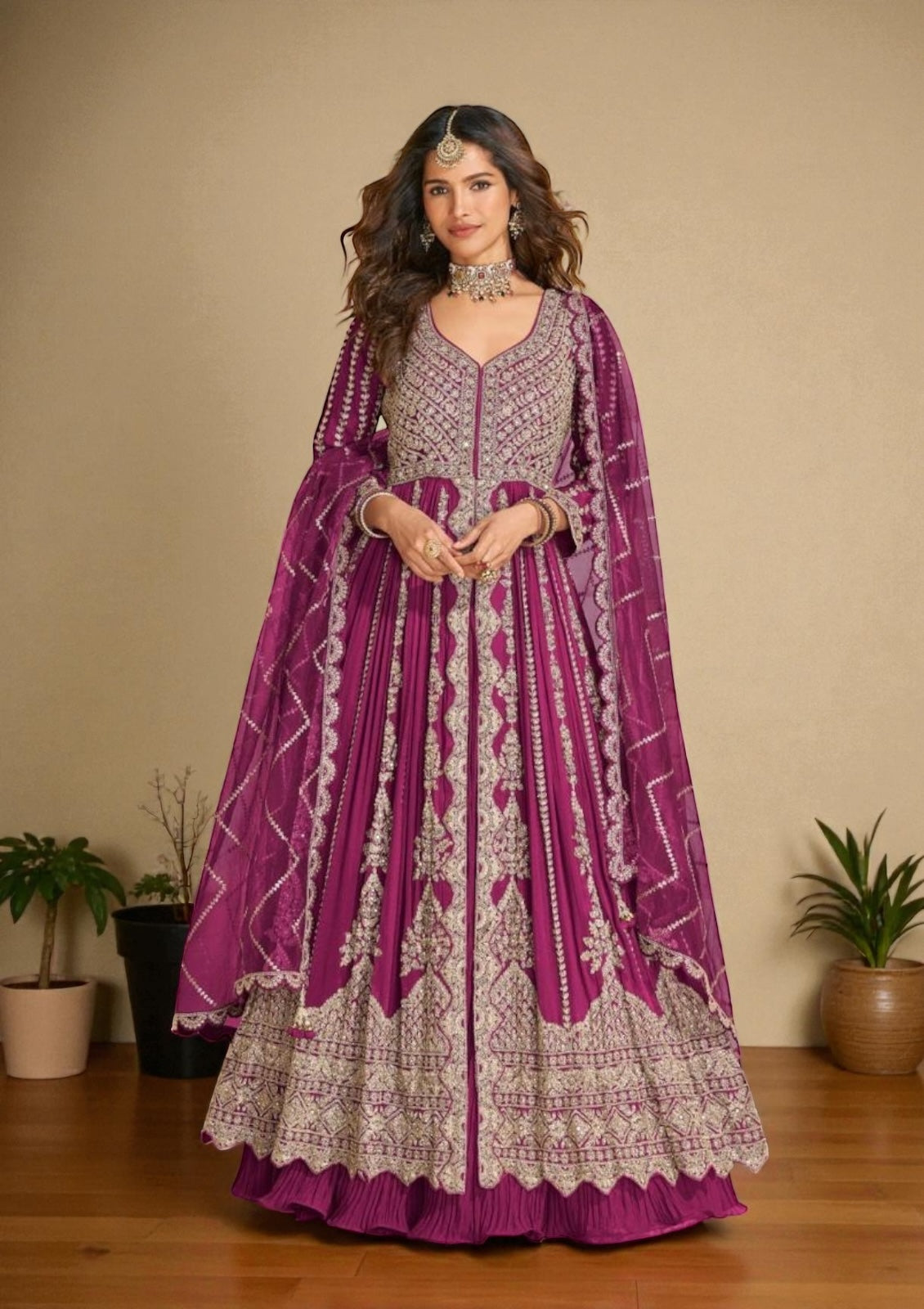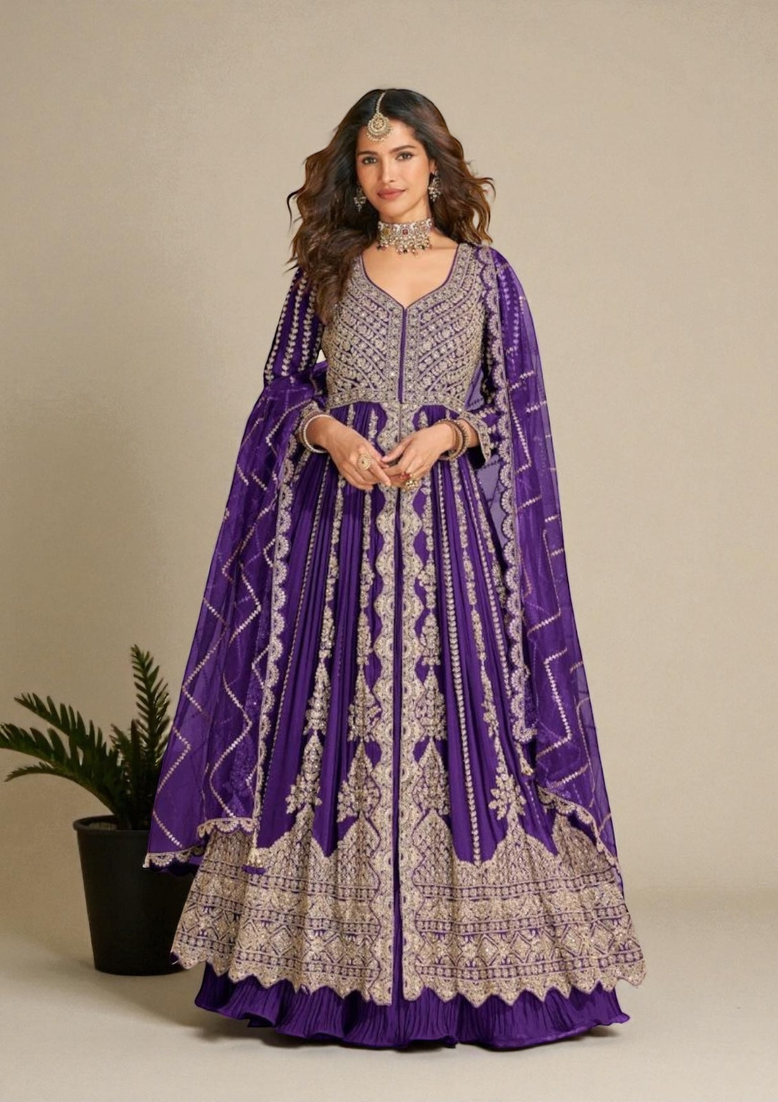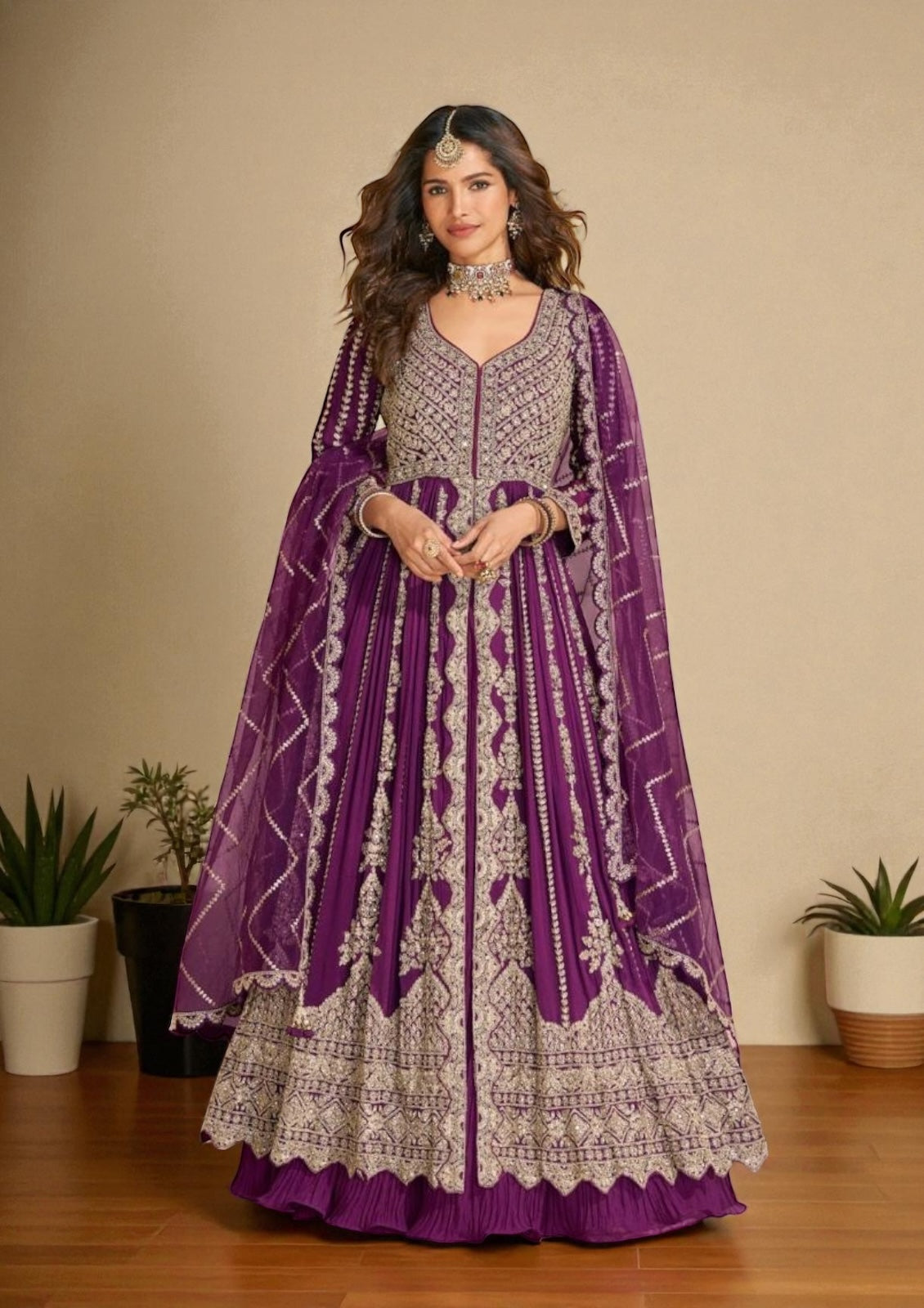 This premium collection of free size, stitched Anarkali dresses is perfect for weddings and parties. Made from real chinon silk, the heavy embroidered top and skirt offer a regal look, while the included dupatta adds an elegant touch. Complete your outfit effortlessly with this must-have collection.