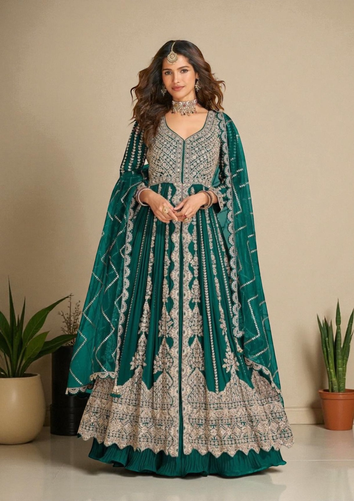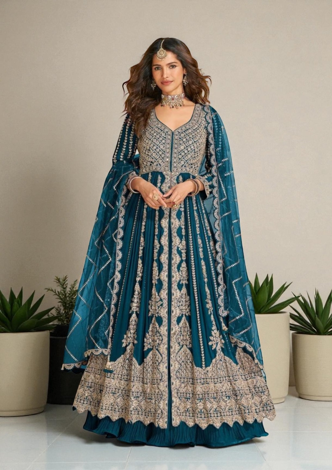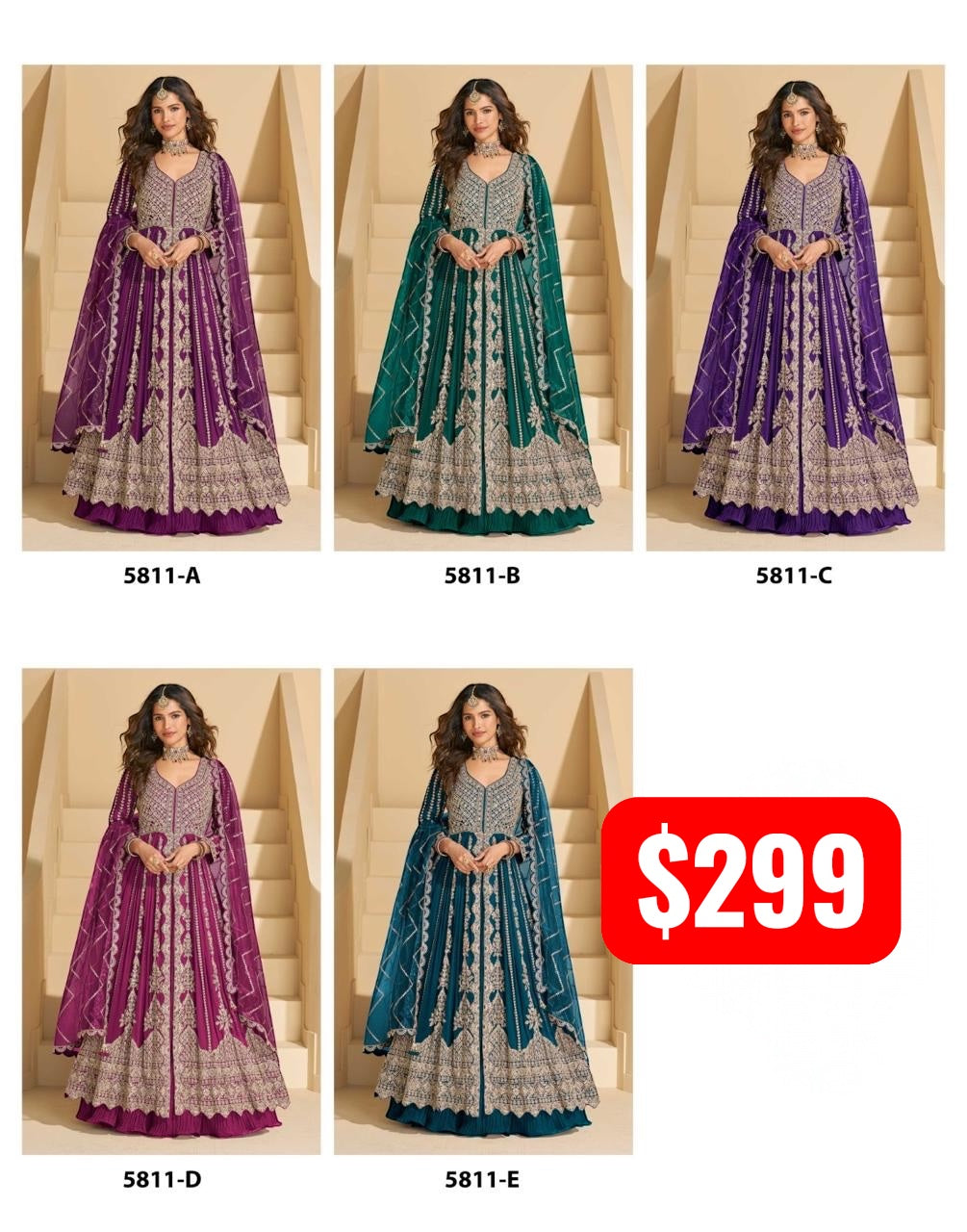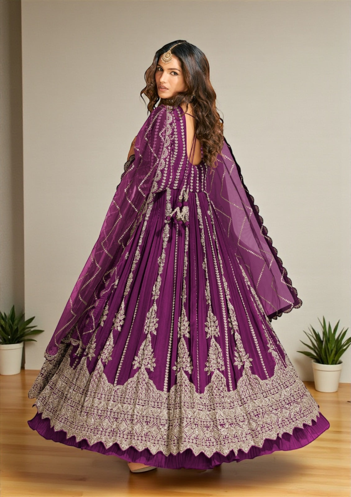 This premium collection of free size, stitched Anarkali dresses is perfect for weddings and parties. Made from real chinon silk, the heavy embroidered top and skirt offer a regal look, while the included dupatta adds an elegant touch. Complete your outfit effortlessly with this must-have collection.